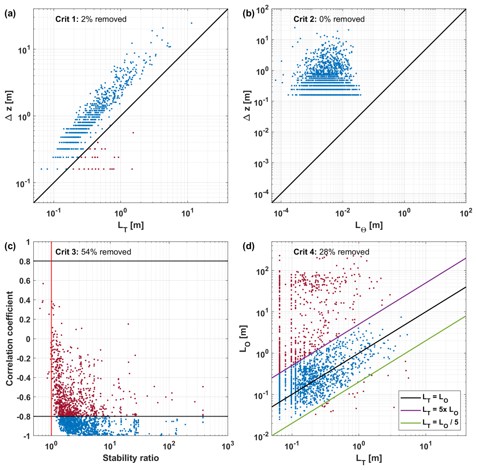 The fundamental assumption for using the Thorpe scale, is that there is a statistical agreement (over a large number of observations) that the Thorpe scale LT is approximately equal to the Ozmidov scale LO (Dougherty, 1961; Ozmidov, 1965). When both length scales are not comparable in size, we argue that Eq. (2) does not hold and therefore we only use overturns for which:
