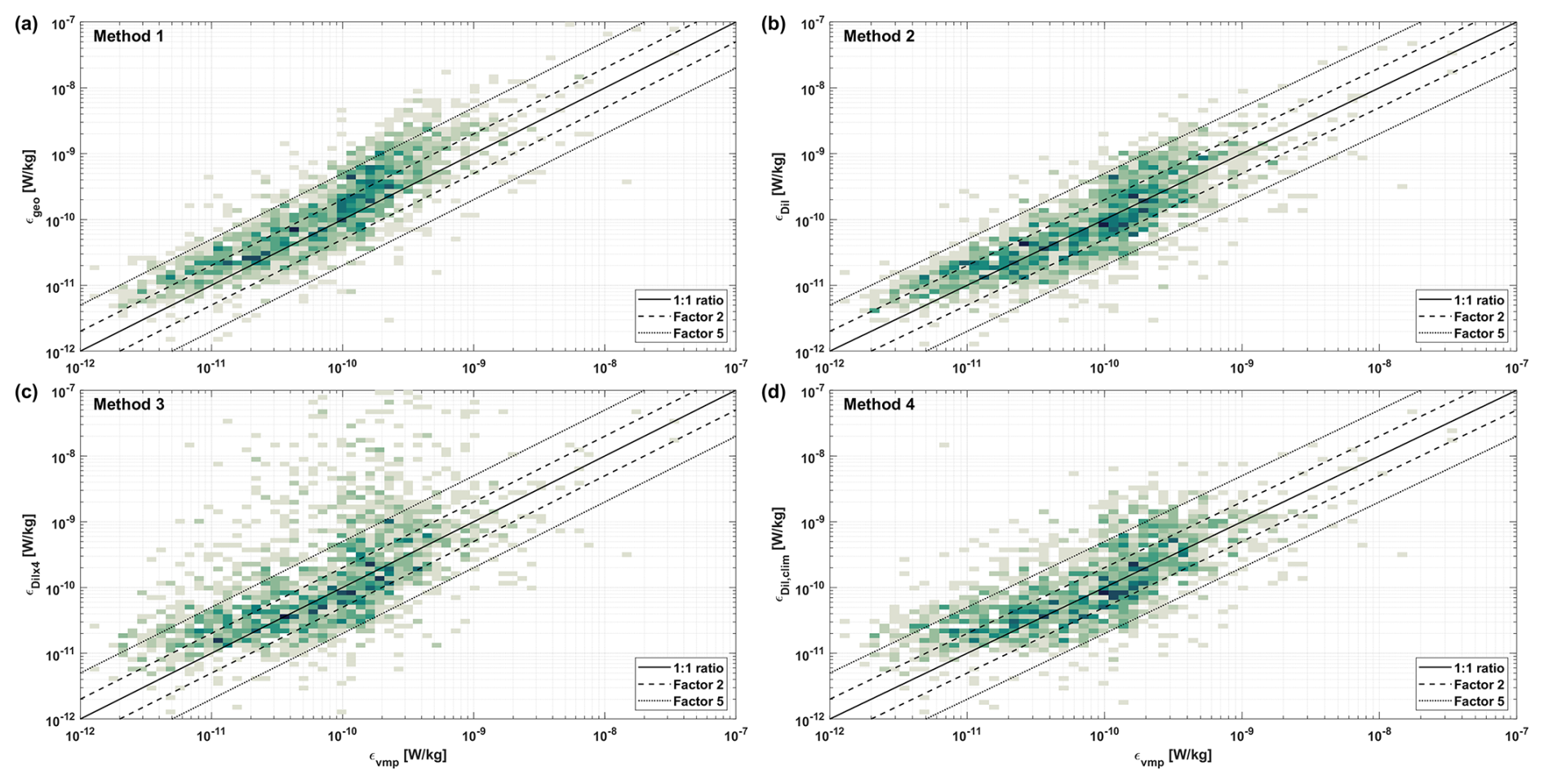 Method 1 is closer to εvmp (factor 1.1) than Method 2 (factor 1.6). However, Method 1 has less estimates within a factor 2 (48 % vs 54 %, respectively) or a factor 5 (87 % vs 92 %, respectively) than Method 2. This indicates that the Method 2 estimates have a narrower spread, but based on the ratio, there is a systematic overestimation as well. Overestimation of the microstructre estimates can be caused by a too coarse sampling resolution of the CTD instrumentation (Sheehan et al., 2023).