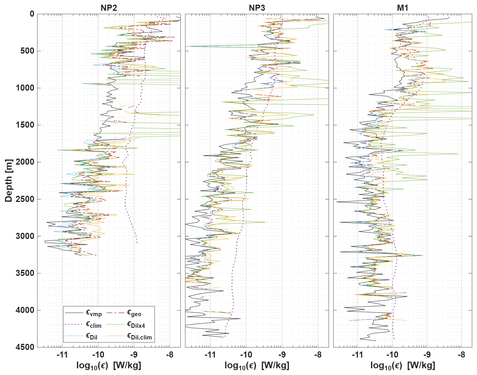 Figure 6Dissipation estimates εTP for all different methods (εgeo: Method 1, εDil: Method 2, εDilx4: Method 3 and εDil,clim: Method 4, as defined in Sect. 5.4) are compared to εvmp and the used climatological estimates εclim. For plotting purposes all data is averaged over the same half overlapping 200 m bins.