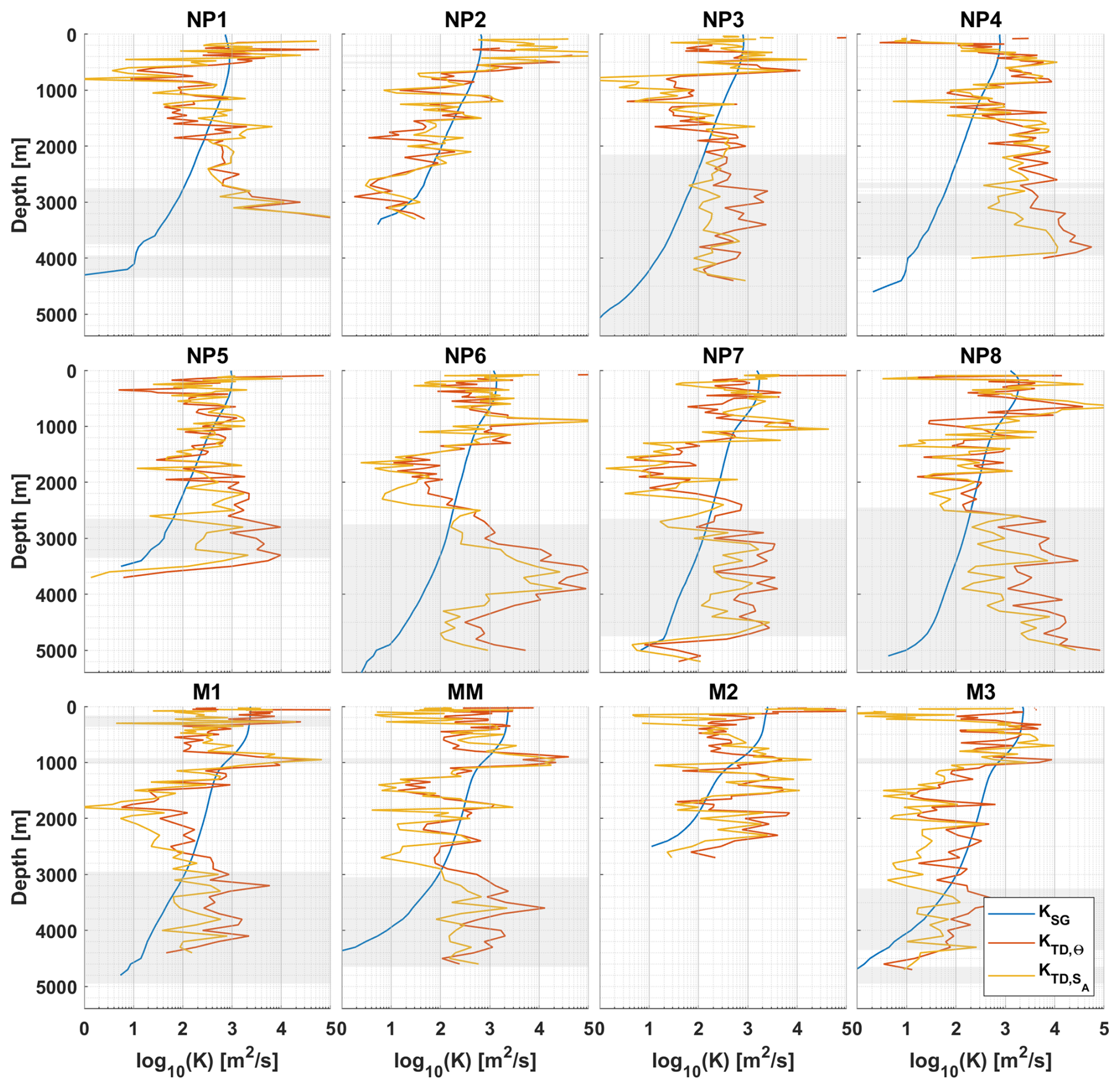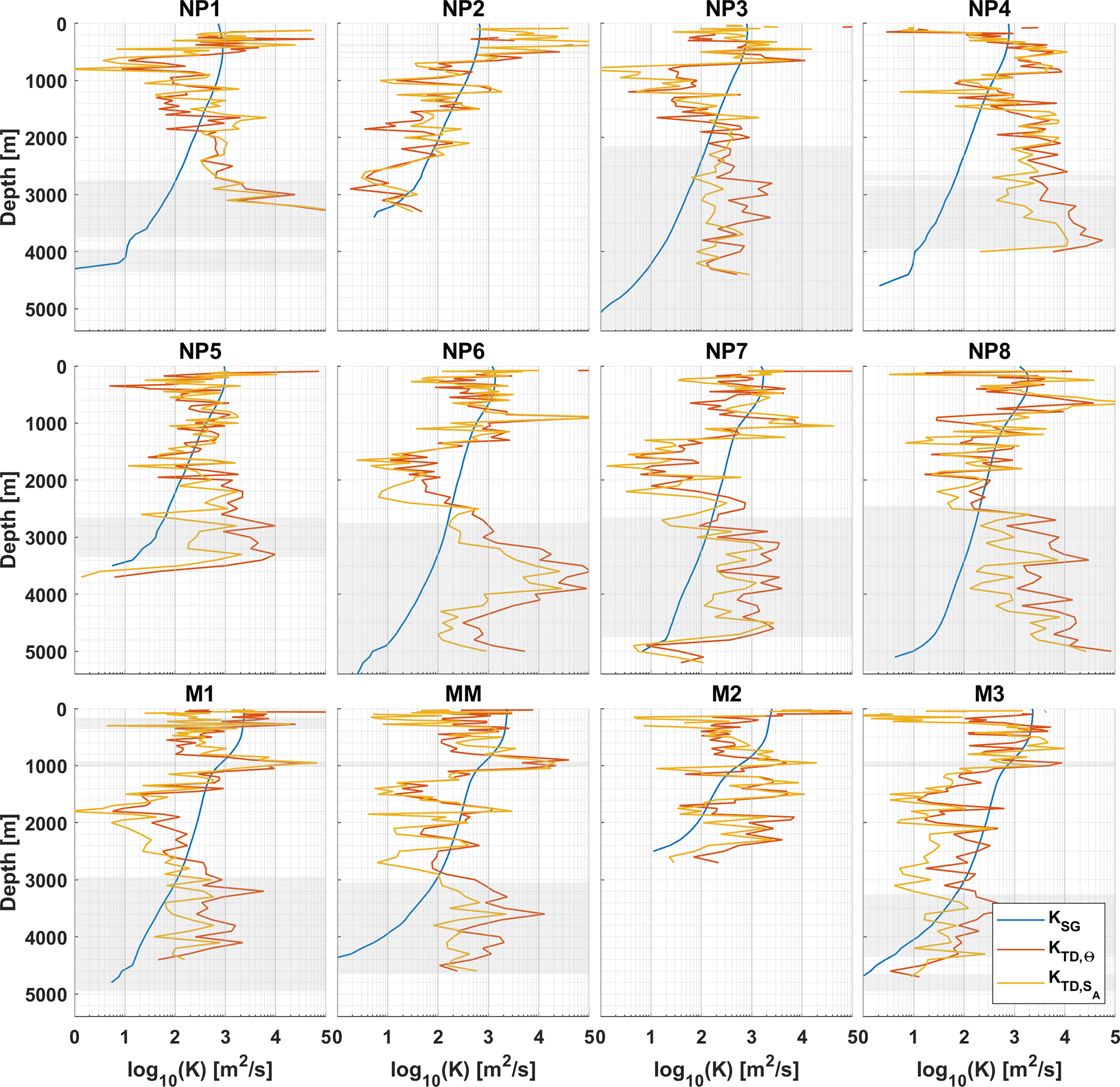 For most of the ocean, e.g. more energetic environments and the upper ocean, there is in general a good agreement between energy dissipation rates measured by the shear probes (εµU) and thermistors (εµT), usually within a factor of 2 (Oakey, 1982; Scheifele et al., 2018; Piccolroaz et al., 2021; Yasuda et al., 2021). In less energetic environments, e.g. the abyssal ocean over smooth topography, there is often a larger discrepancy between the two types of probes (Fig. 2). These discrepancies are particularly noticeable in the deep parts of station NP3, below 2000 m, where εµU saturates at W kg−1 whilst εT reaches values as low as W kg−1.