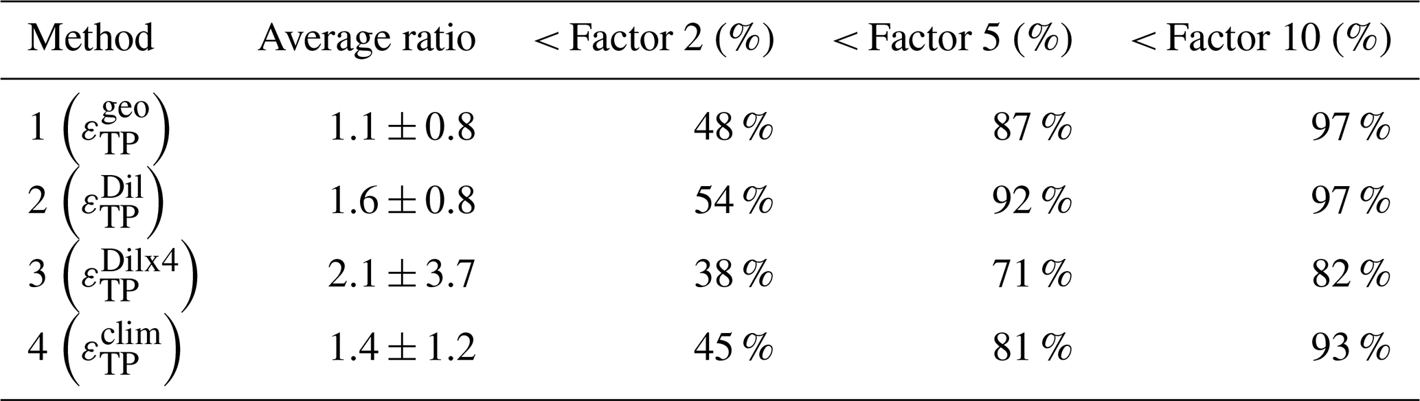 Table 2Overview of the performance of methods 1–4 for all data. The “average ratio” is based on the geometric mean of the ratio , ± the geometric standard deviation. The last three columns indicate the percentage of estimates that falls within the respective factor compared to εvmp.