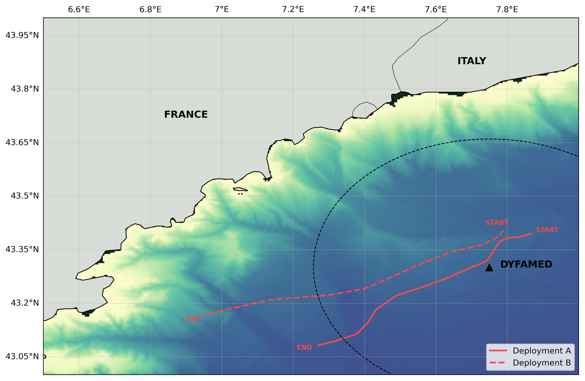 Figure 1Float trajectories during sea trials conducted in the Ligurian Sea in February and March 2025. Deployment A (solid line) and Deployment B (dashed line) are shown along with a concentric dashed circle (40 km radius) centred on the DYFAMED station. The 40 km radius was used to spatially filter float data for refitting and validation of wind estimates at DYFAMED, as described in Cauchy et al. (2018).