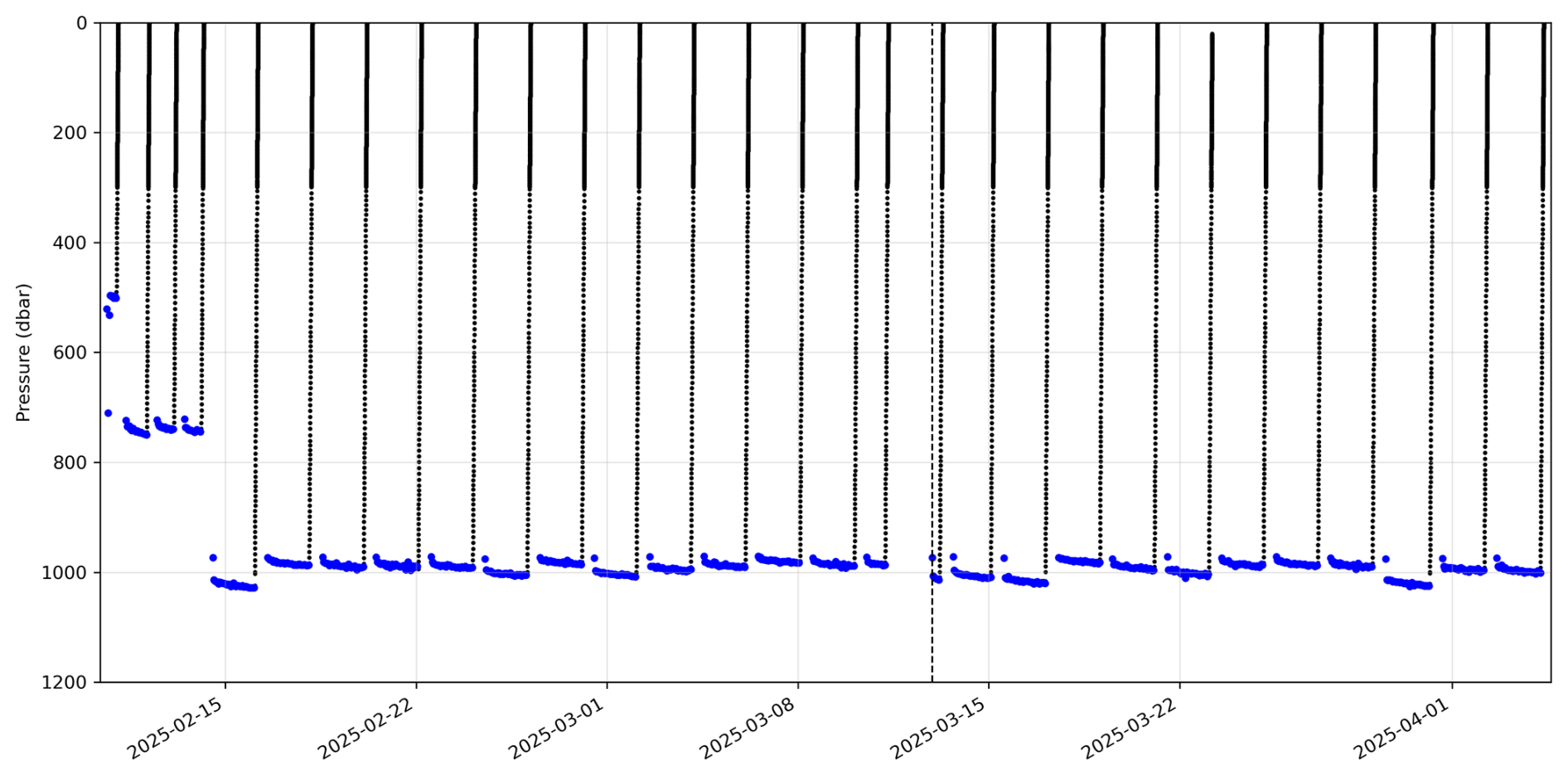 Figure 3Vertical profiles from the acoustic-equipped profiling float deployed near DYFAMED between February and April 2025. Blue points indicate times when passive acoustic data were successfully recorded. The vertical dashed line marks the transition between Deployment A and Deployment B.