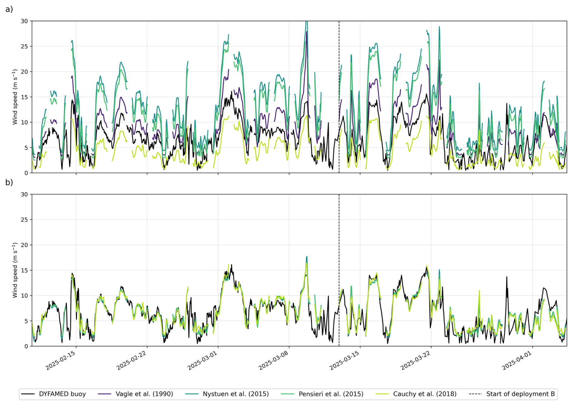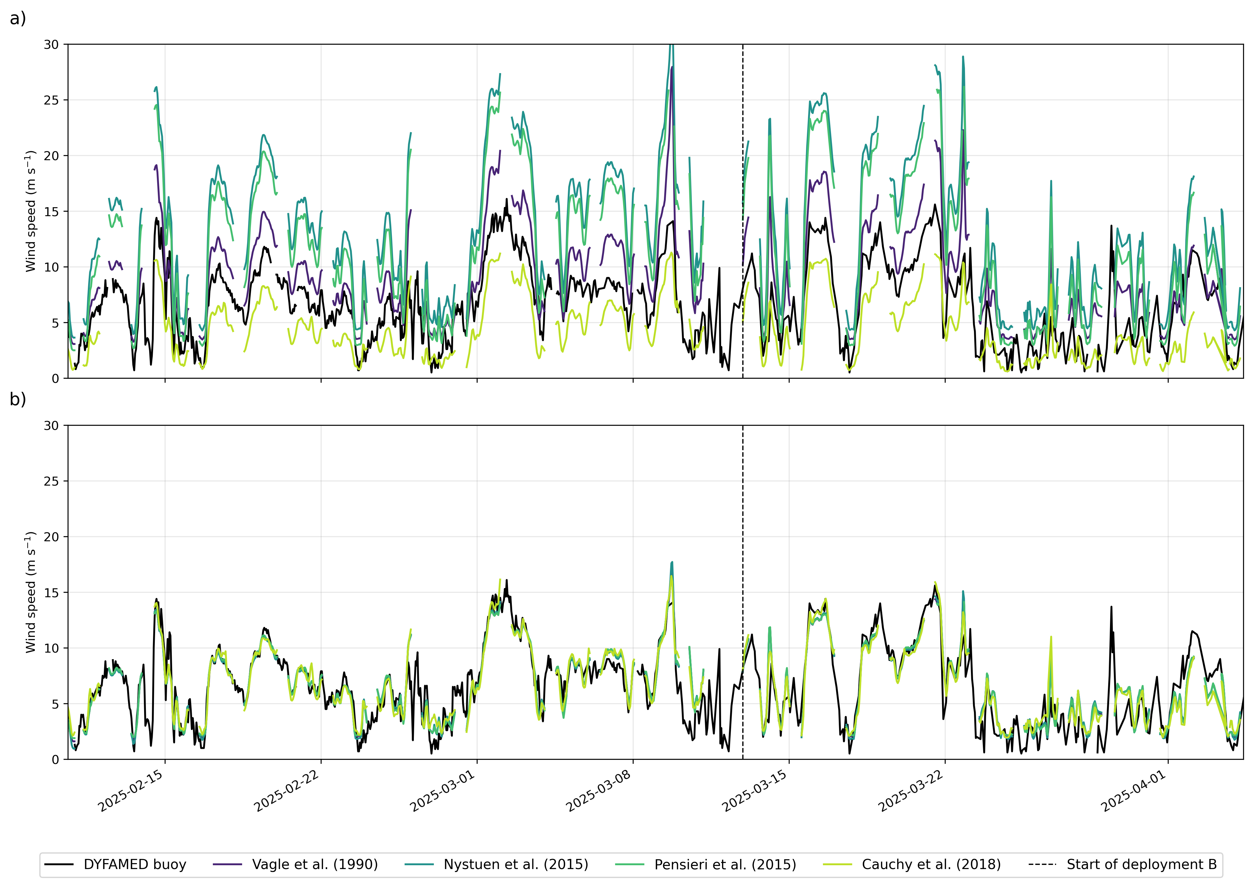 Figure 4Comparison of unoptimized (top) and optimised (bottom) wind speed models against DYFAMED buoy observations. Each subplot shows modelled wind speed estimates from four literature models (Vagle et al., 1990; Nystuen et al., 2015; Pensieri et al., 2015; Cauchy et al., 2018) compared with collocated buoy wind data (black line). The unoptimized models (a) use original published coefficients, while the optimised models (b) are re-fitted using data within 40 km of the DYFAMED site. The dashed vertical line indicates the start of deployment B.