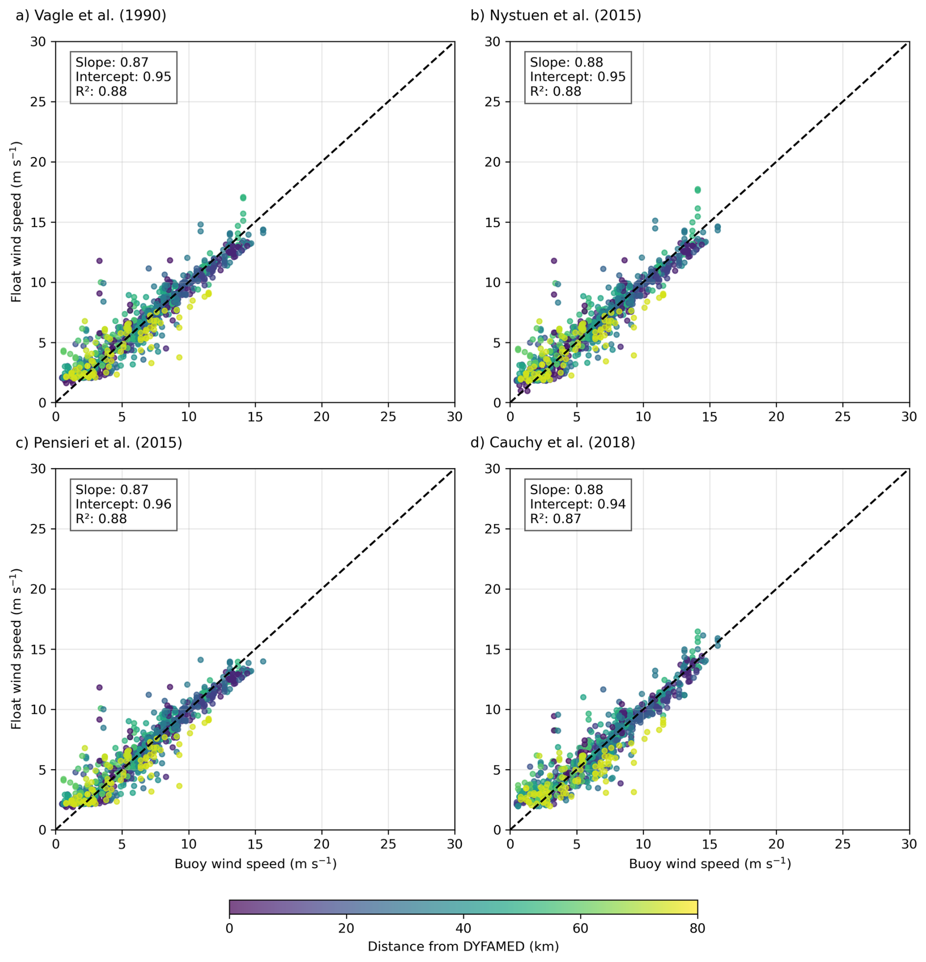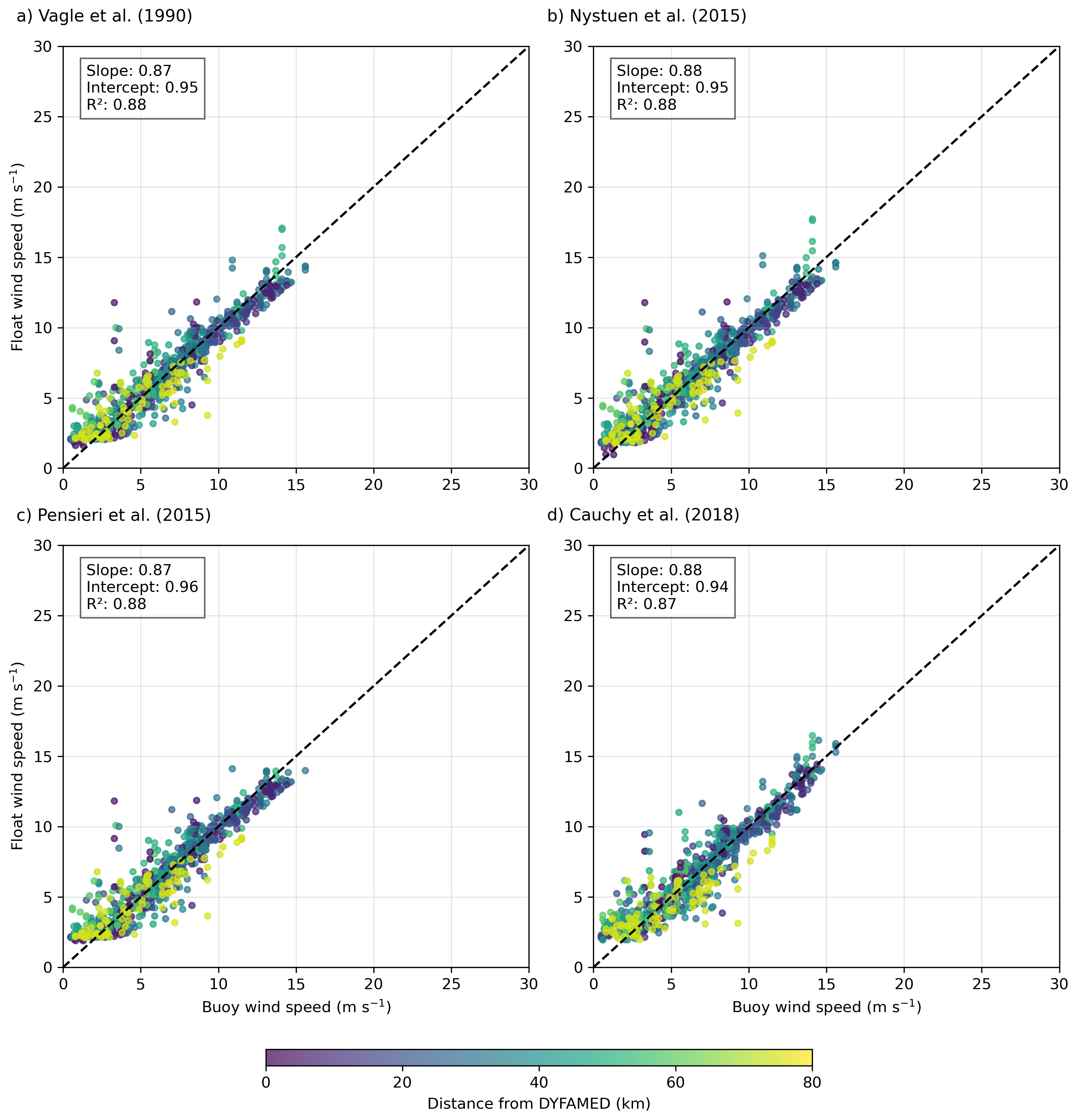 Figure 5Comparison of optimised wind speed estimates from four literature models against collocated DYFAMED buoy wind measurements. Each subplot (a–d) shows scatter plots of float-derived wind speed vs. buoy wind speed using model-specific optimised coefficients: (a) Vagle et al. (1990), (b) Nystuen et al. (2015), (c) Pensieri et al. (2015), and (d) Cauchy et al. (2018). Points are color-coded by distance from the DYFAMED buoy, and the dashed line represents the 1:1 reference. Insets display linear regression slope, intercept, and coefficient of determination (R2).