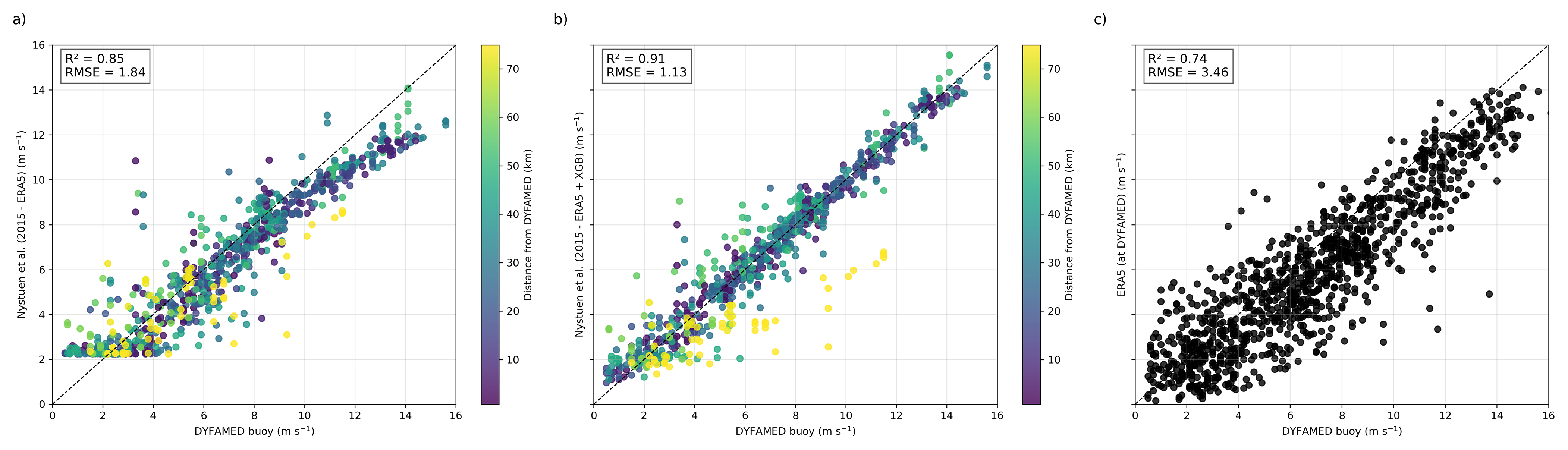 Figure 6Comparison between DYFAMED buoy wind speed measurements and float-derived estimates using the Nystuen et al. (2015) acoustic model: (a) wind speeds estimated using Nystuen's polynomial formulation fit to ERA5; (b) same model corrected using a residual-learning approach with XGBoost, trained on the differences between ERA5-based estimates and DYFAMED observations; and (c) ERA5 wind speed at the DYFAMED grid point compared directly to buoy measurements for February, March and April 2025. Each point is colored by the float's distance from DYFAMED in panels (a) and (b). Dashed lines denote 1:1 agreement. All wind speeds are expressed in meters per second (m s−1).