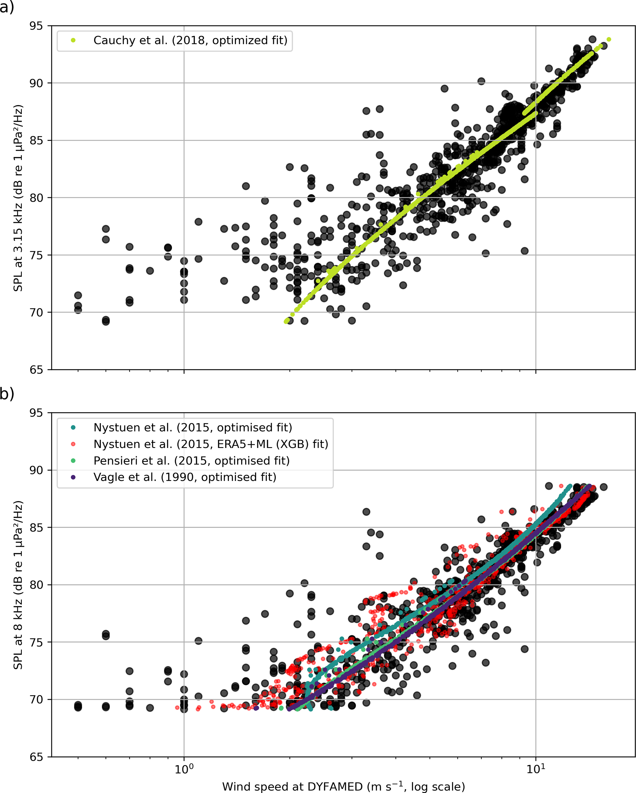 Finally, we included the two-regime log–linear model from Cauchy et al. (2018), developed using acoustic data from a glider operating in the western Mediterranean. Designed for mobile platforms, the model relates wind speed to third-octave noise levels centred at 3.15 kHz. The model uses distinct logarithmic and linear fits across two noise regimes.