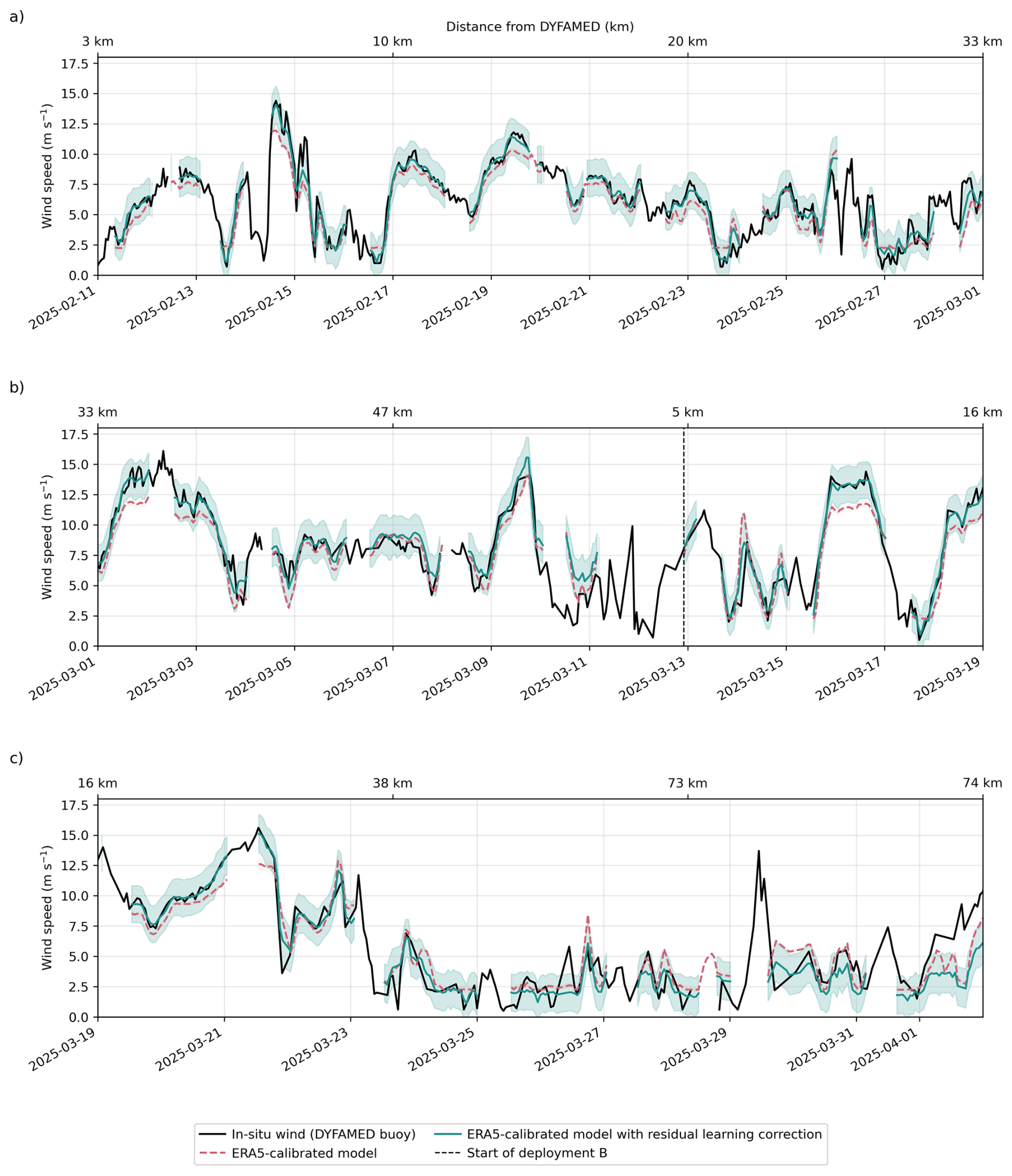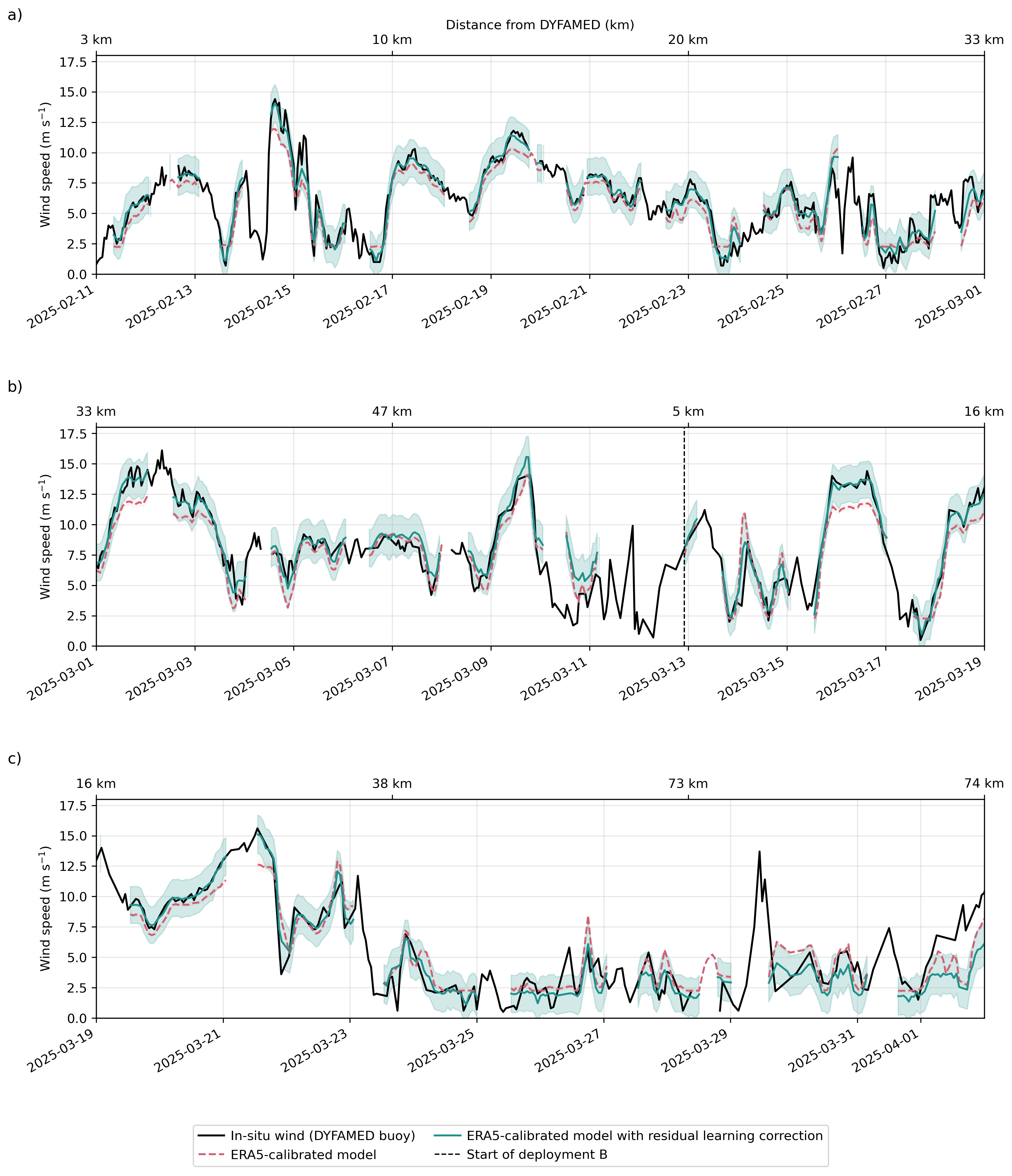Figure 8Time series comparison between acoustic float wind estimates and DYFAMED buoy winds, displayed over three consecutive 18 d windows (a–c). The dashed pink curve corresponds to wind speeds predicted using the Nystuen et al. (2015) acoustic model calibrated solely with ERA5 reanalysis winds. The solid blue line shows the same model after applying the residual-learning correction (XGBoost), and the shaded region indicates its associated predictive uncertainty. Buoy-measured wind speed is shown in black. The upper x-axis reports the float's distance from DYFAMED throughout the record, and the dashed vertical line indicates the transition to deployment B.