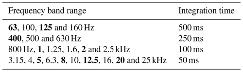 Table 1Integration times applied to third-octave bands during acoustic signal processing, varying by frequency range to balance energy and spectral accuracy. In bold, the bands transmitted in the 9-band float configuration.