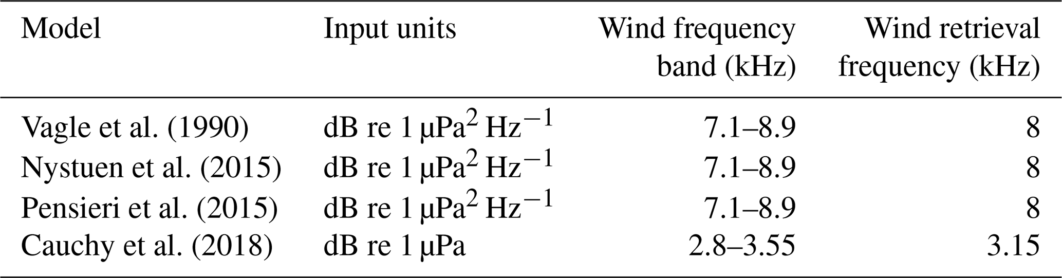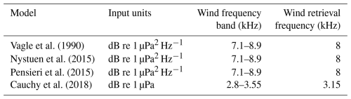 These four models were selected to represent a range of analytical formulations commonly used in acoustic wind retrievals. They all use frequency bands where wind-driven bubble noise typically dominates the local ambient sound field, with reduced interference from low-frequency sources such as distant shipping. Our aim was not to exhaust all available models, but rather to evaluate a representative subset under consistent float-specific conditions, emphasizing the effect of model structure and local fitting.