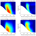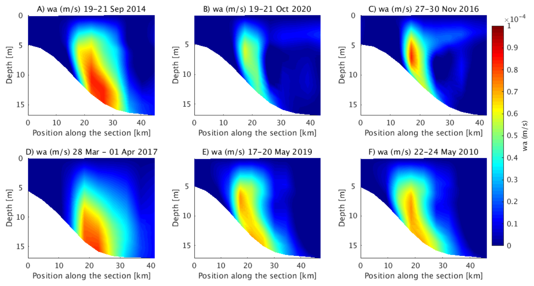 Figure 11Vertical velocity anomalies (wa) profiles for spring upwelling (a–c) and autumn upwelling events (d–f).