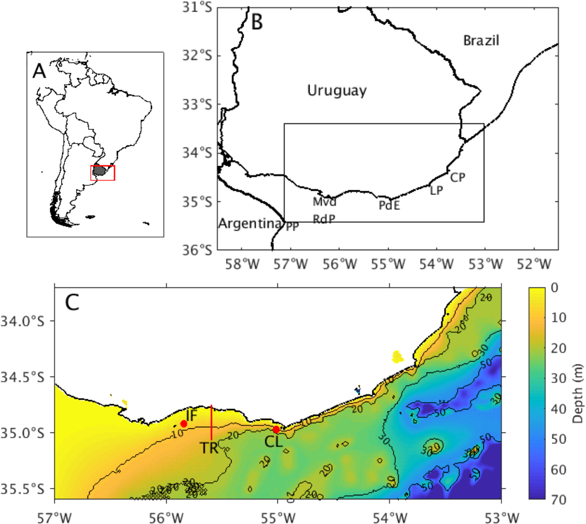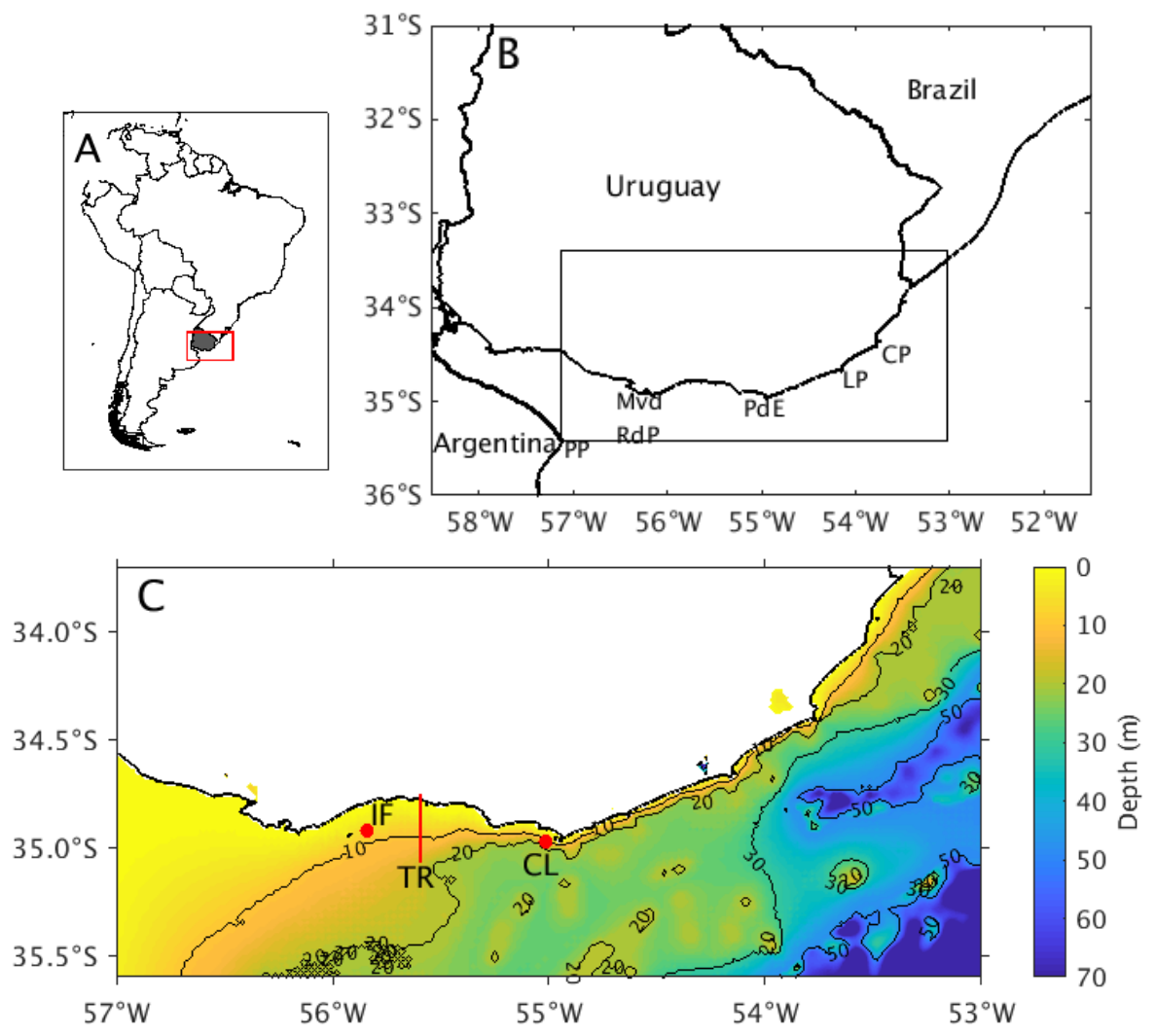 Figure 1(a) Geographical context of the study area, showing Uruguay within South America; the red rectangle indicates the region displayed in panel (b). (b) Model setup area along the Uruguayan shelf. The inner rectangle indicates the subdomain used for the analysis and identification of upwelling events. Mvd: Montevideo; PdE: Punta del Este; LP: La Paloma; CP: Cabo Polonio; PP: Punta Piedras; RdP: Río de la Plata. (c) ETOPO1 bathymetry (color scale in meters). Black contours indicate selected isobaths. IF marks Isla de Flores (location used for model – observation comparison of SST and SSS); CL indicates the coastal location used to extract vertically averaged seasonal profiles; TR denotes the transect used to analyze the vertical structure of simulated upwelling.