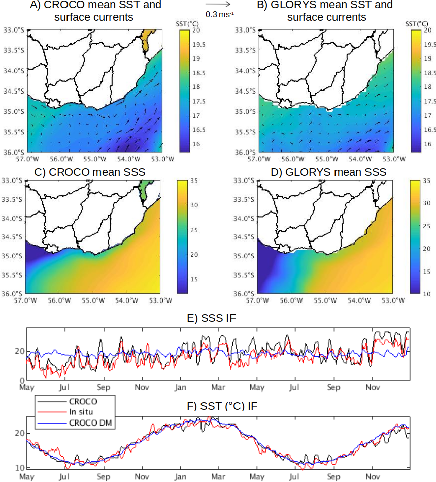 Daily SSS and SST simulated variability for the period 2018–2020; were also compared to in situ observations obtained from an instrumented coastal monitoring station located at Isla de Flores (IF, marked in Fig. 1c; 55.9 °W–34.9 °S), which provides continuous near-surface measurements of temperature and salinity (Trinchin et al., 2021; Brum, 2024). In addition, vertical simulated temperature and salinity distributions were compared with measured data from one Argentine research campaign conducted aboard the Dr. Eduardo Holmberg vessel in June 2006 (BaRDO INIDEP database, 2025). Conductivity–temperature–depth (CTD) profiles were collected in the Uruguayan coastal and adjacent oceanic regions. Those data are freely available in the BARDO web page.