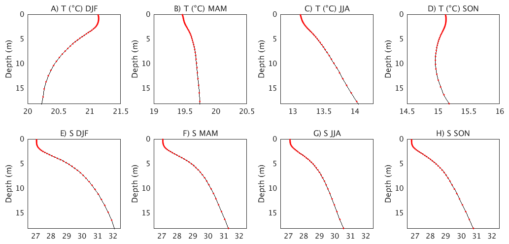 Figure 3Simulated seasonal average vertical profiles of temperature (a–d) and salinity (e–h) at the coastal location (35.1° S, 55° W). Different scales were used for temperature profiles.