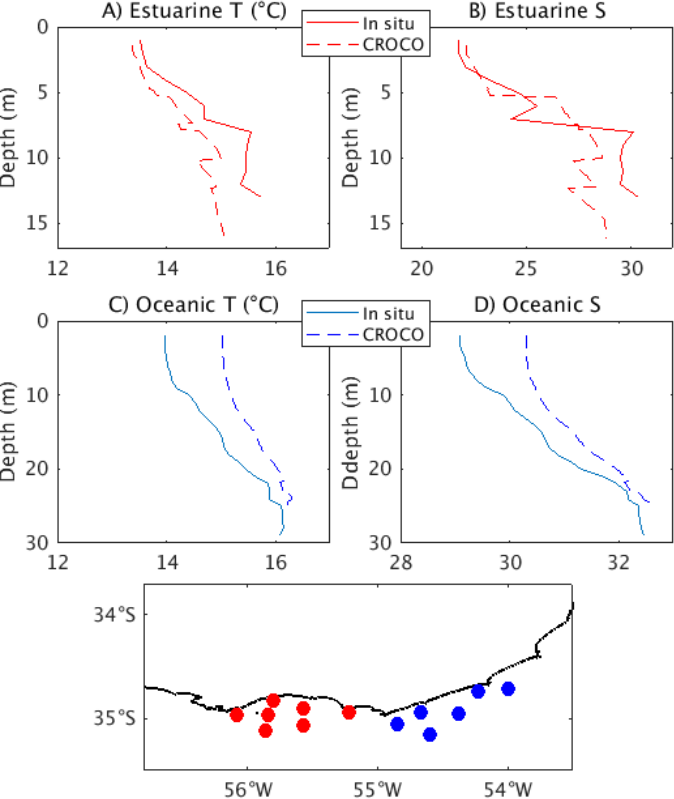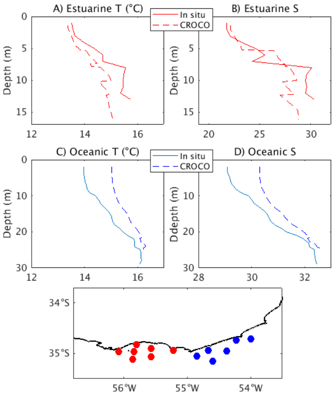 The limited availability of in situ data prevents the development of a reliable climatology for direct comparison with our simulations, emphasizing the importance of numerical modeling for understanding coastal dynamics. Despite the lack of continuous observational data to construct climatological profiles, a consistent pattern with the simulations was observed during the Argentine research campaign conducted aboard the Dr. Eduardo Holmberg vessel in June 2006 (BaRDO INIDEP database, 2025), These allowed a comparison between the average vertical profiles from stations located in the estuarine and oceanic regions; and the average profiles simulated by CROCO for the same locations and period. The observed and simulated profiles were found to be consistent with the winter climatological simulated profile, showing warmer and saltier waters at depth for both regions (Fig. 4). Some differences between observed and simulated gradients were expected due to spatial mismatches between station locations and model grid cells, as well as temporal variability not resolved by daily model averages.