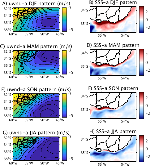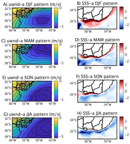 Figure 5SVD leading mode for each season. The left panel (a, c, e, g) represent the u-wind anomalies pattern while the right panel (b, d, f, h) represent the Sea Surface Salinity anomalies pattern for each analyzed season (summer, autumn, spring and winter, respectively).