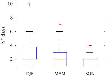 Figure 6Distribution of intense upwelling events duration for each season. The red line inside each box indicates the median, the box spans the interquartile range (difference between the 75th and 25th percentiles), whiskers extend to 1.5 times the interquartile range, and crosses denote outliers.