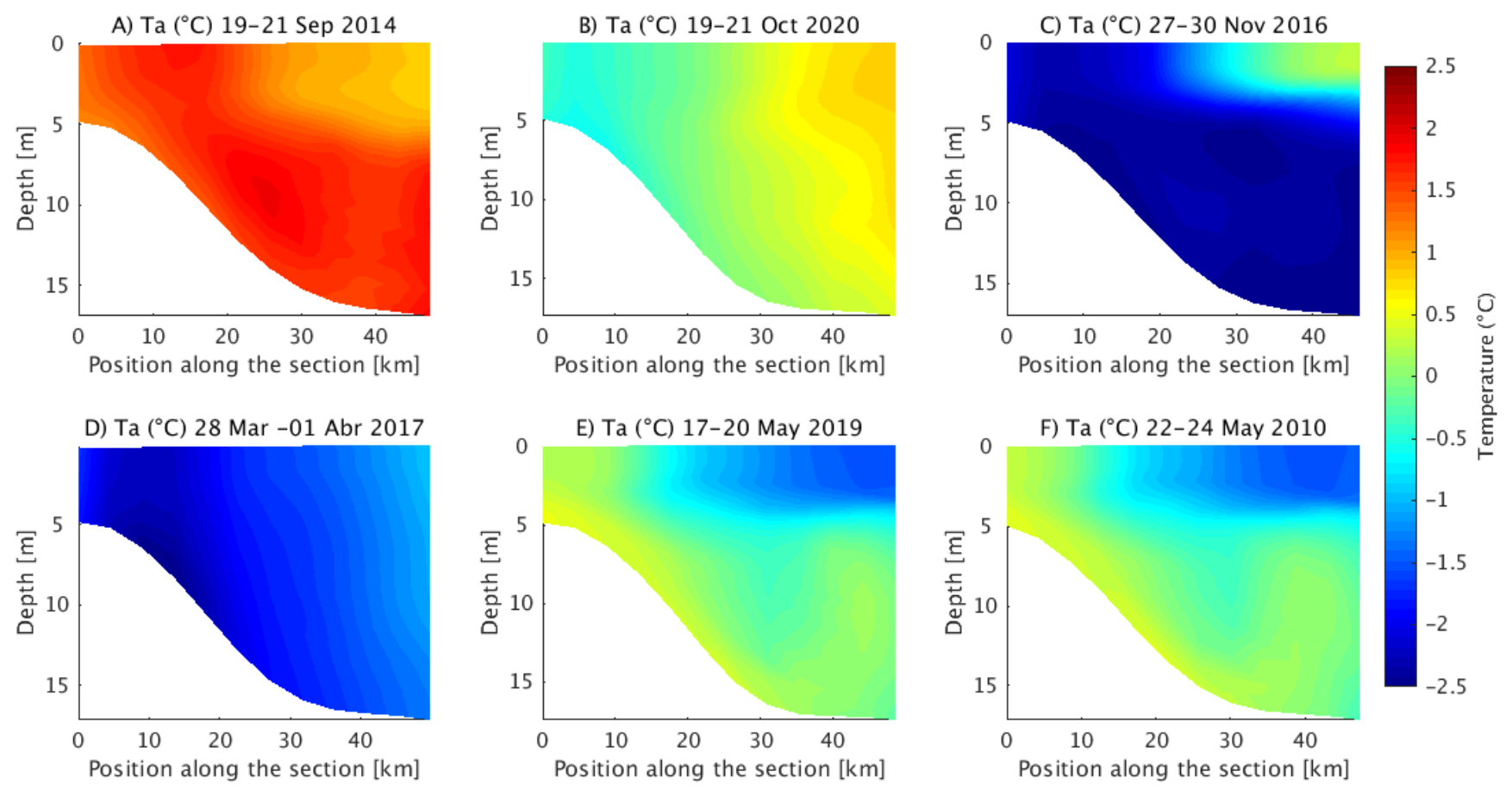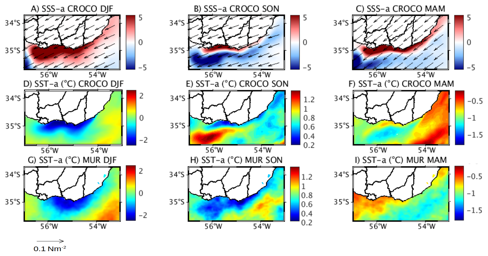 As a result, the occurrence of upwelling during the rest of the year, as well as its hydrographic characteristics and associated processes, remain largely unexplored. Although easterly winds are more frequent and persistent during summer, upwelling-favorable winds also occur throughout the year (Simionato et al., 2005). While the underlying mechanism is expected to be similar, the properties of the upwelled waters and their surface expression are likely to differ across seasons due to changes in surface heat fluxes and vertical thermal structure.