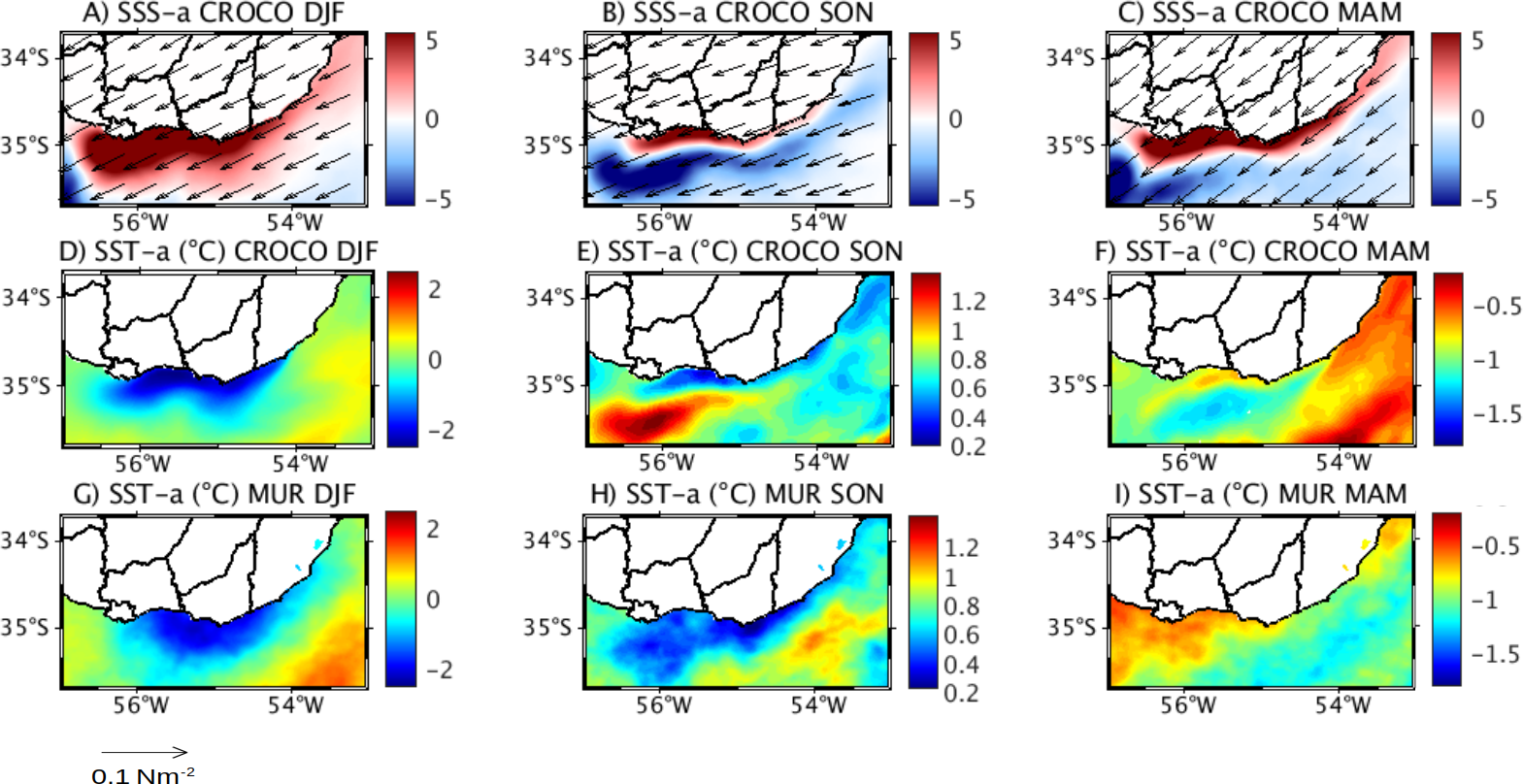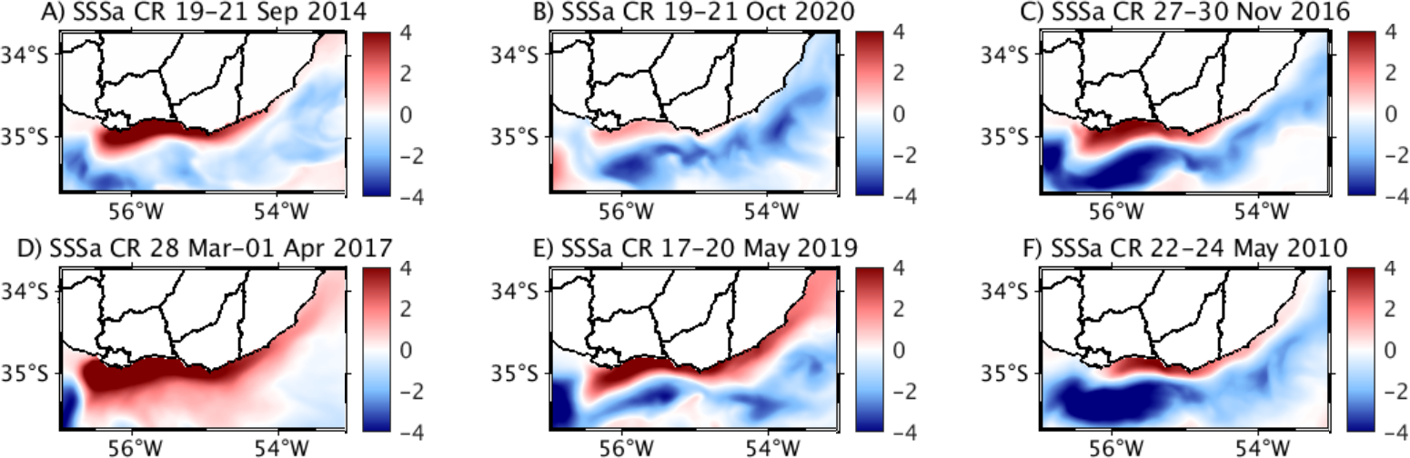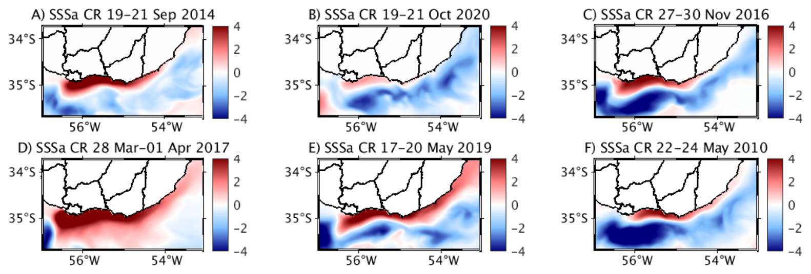 In this context, Sea Surface Salinity (SSS) distribution could serve as an alternative proxy to SST for identifying upwelling along the Uruguayan coast throughout the year, as the water column is expected to remain on average vertically stratified with saltier water closer to the bottom, as this is a salt wedge estuary (Guerrero et al., 1997). Therefore, during upwelling the surface water would likely show positive SSS anomalies regardless of the time of year. In this regard, increased surface salinity in the Uruguayan coast (particularly between Montevideo and Punta del Este) under upwelling-favorable wind conditions has been reported in numerical simulations (Meccia et al., 2013; de Mello et al., 2022a).