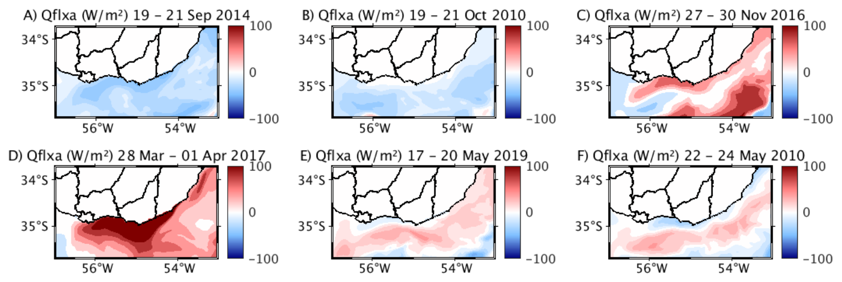 During spring, one event for each month was analyzed: September (19–21 September 2014), October (19–21 October 2020), and November (27–30 November 2016). The September event exhibited positive SSSa and SSTa near the coast, together with also positive SSTa offshore but less intense. In concordance with the surface pattern, the vertical section shows anomalously warm water not vertically stratified close to the coast (indicating upwelling) and warmer subsurface water reaching the surface during the upwelling (Figs. 9a and 10a). There is also simulated heat loss to the atmosphere, maximum in the upwelling region, also concordant with warm water upwelling (Fig. 12a). During the October event, close to zero SSTa were observed in the coastal region together with positive SSTa offshore (Figs. 9b and 10b). Contrary to the September event, during October in the upwelled water region there is no heat loss to the atmosphere (Fig. 12b). Finally, the November event displayed a similar pattern to the summer upwelling events described in detail by de Mello et al. (2022a), characterized by saltier and colder water reaching the surface and a gain of heat from the atmosphere buffering the cold water upwelling (Figs. 9c, 10c and 12c).