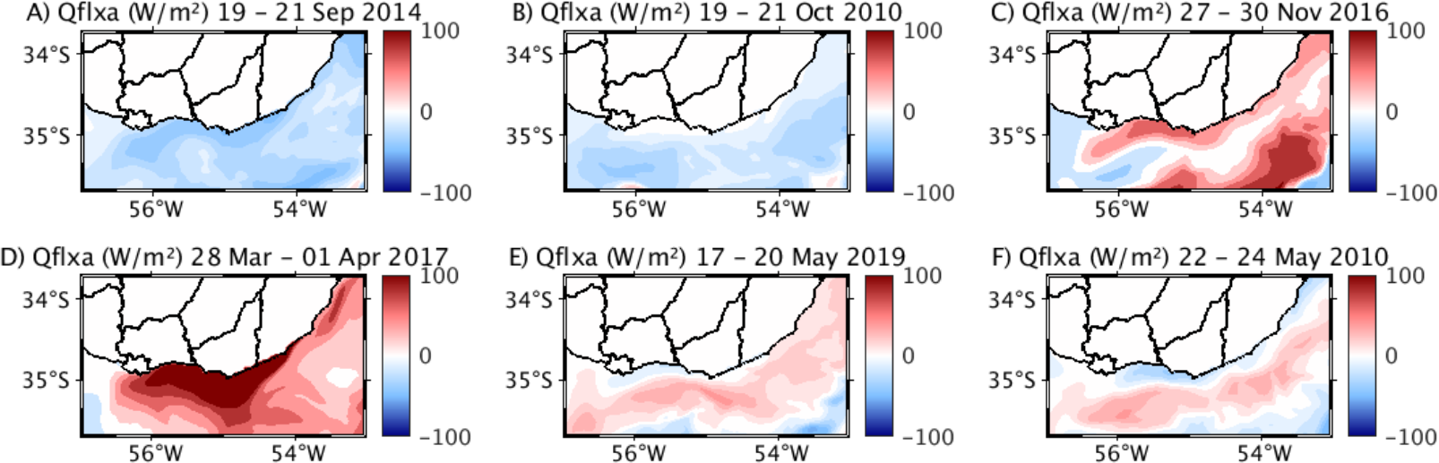 Figure 12Simulated net heat flux anomalies distribution during selected upwelling events (positive values represents a gain of heat into the ocean).