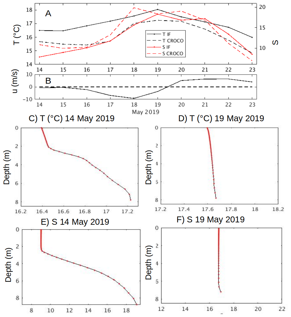 Figure 13(a) In situ (T IF and S IF) and simulated (T CROCO and S CROCO) temperature and salinity at Isla de Flores Location during the period 14–23 May 2019. NCEP2 zonal wind component for the Uruguayan coast (b). Simulated vertical profiles of salinity and temperature for 14 and 19 May 2019 at Isla de Flores location (d–f).