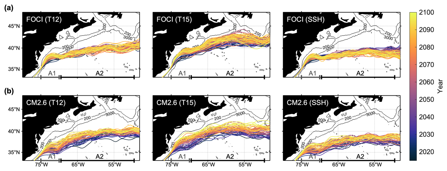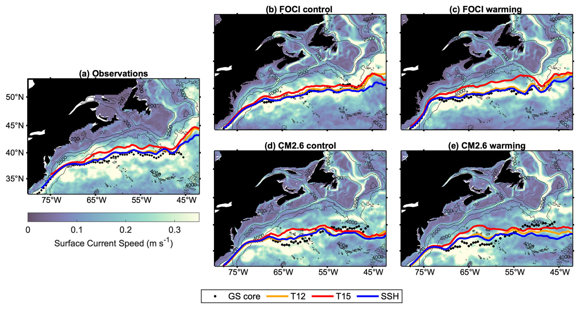 Monthly outputs from the climate model CM2.6 and the Flexible Ocean Climate Infrastructure (FOCI) model are used to investigate the long-term changes in the location of the GS under both preindustrial and high CO2 emission scenarios. These models are particularly suited for examining changes in ocean circulation due to their high-resolution capabilities and ability to simulate mesoscale processes (Matthes et al., 2020; Saba et al., 2016).
