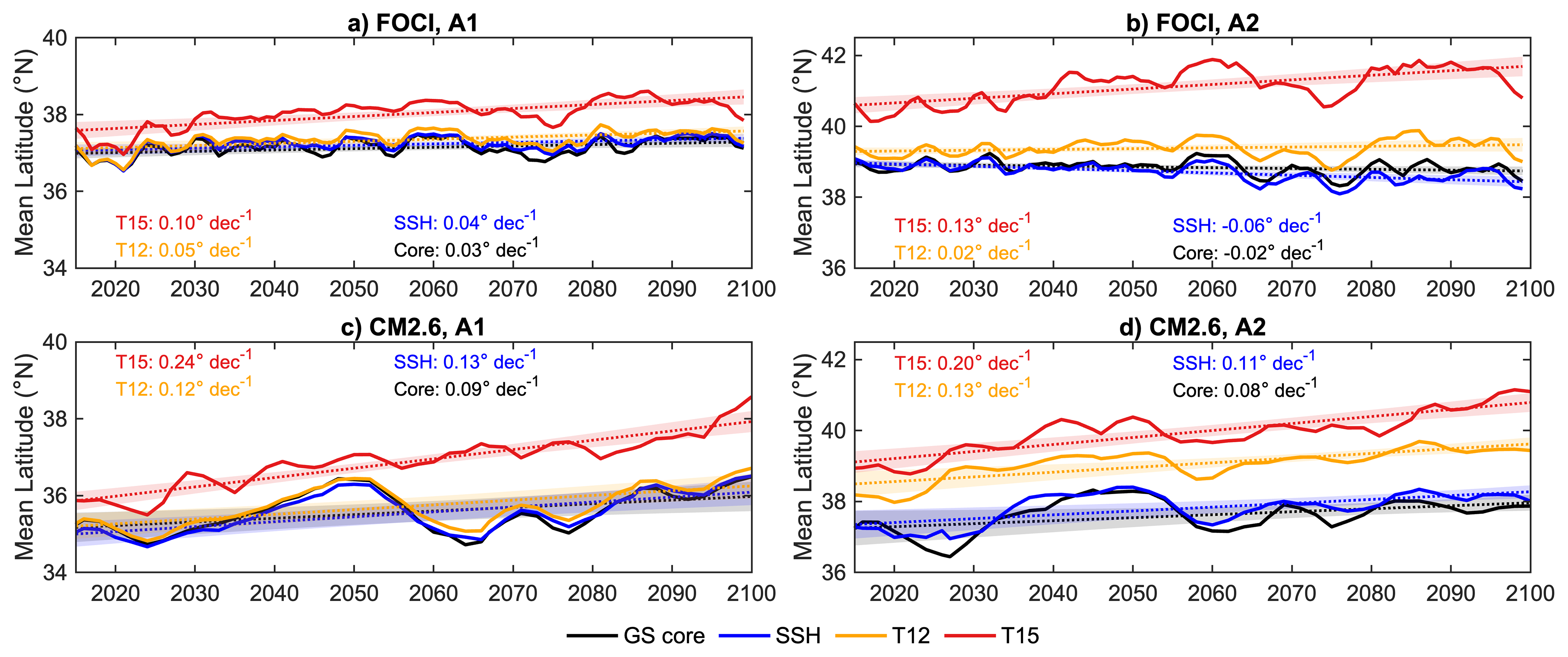 Figure 5Mean latitude of the temperature-based (T12 and T15) and SSH-based Gulf Stream path criteria averaged over two regions: A1 (75 to 70° W, grey bracket in Fig. 4) and A2 (71 to 50° W, black bracket in Fig. 4) in FOCI (a, b) and CM2.6 (c, d) simulations. Solid lines show the annual mean latitude of each proxy, along with the reference Gulf Stream core position (GS core). Dotted lines indicate the corresponding linear trends, and shaded bands represent the 95 % confidence interval of the fitted mean trend. Trend magnitudes (in ° latitude per decade) are reported within each panel for each proxy. Trend statistics are provided in Table S1.