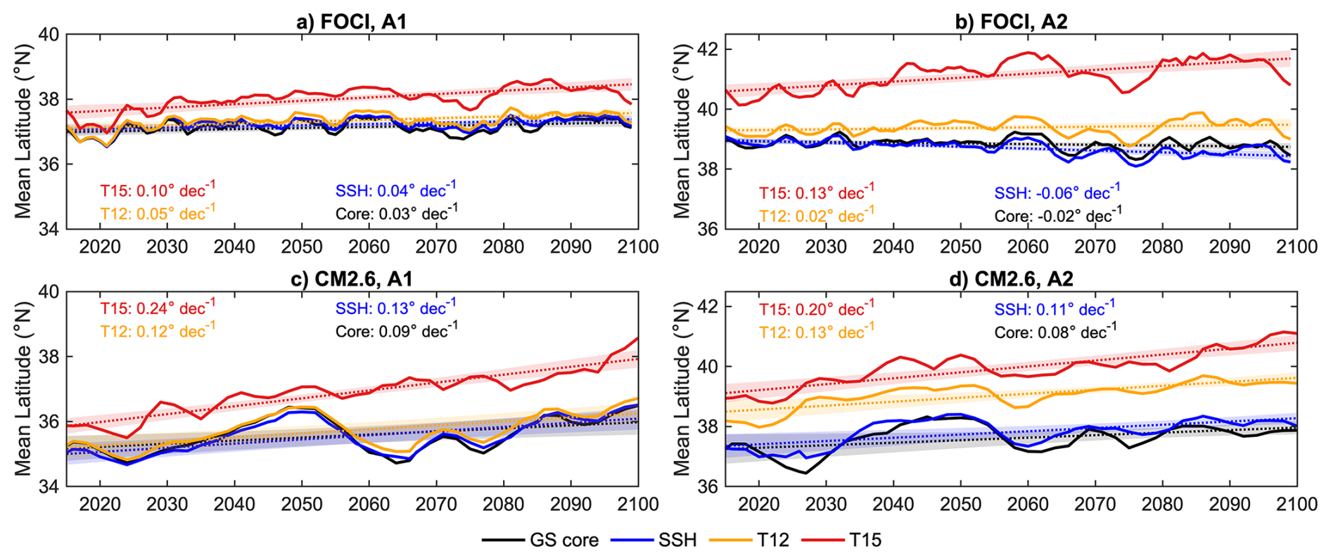 In both models, the temperature-based criteria (T12 and T15) suggest pronounced northward shifts in the GS path in the warming scenarios that do not match the actual shifts of the GS core and do not occur in the pre-industrial simulations. In the pre-industrial control runs of both models, the SSH and T12 criteria closely predict the location of the GS core while T15 is biased northward (see Fig. 3b and c). In the warming simulations already in 2015, the T12 and T15 are located well northward of their pre-industrial analogs, while the SSH criterion remains closely aligned with the GS core (Fig. 3b and c). The same appears to be the case for observations (Fig. 3a), at least qualitatively, although we cannot separate the warming contribution from the pre-industrial, because observations for the latter are not available. The evolution of the mean latitude of the GS from 2025 to 2100 differs between FOCI and CM2.6. In FOCI, the GS core east of 71° W moves slightly southward by 0.02° per decade while T12 and T15 move northward by 0.02 and 0.13° per decade, respectively (Fig. 5). In CM2.6, the GS core east of 71° W moves northward by northward by 0.08° per decade while T12 and T15, both already located significantly further north than the GS core in 2015, move northward by 0.13 and 0.20° per decade, respectively (Fig. 5). In other words, while the North Wall closely follows the axis of maximum velocity near Cape Hatteras (west of 74° W), east of 71° W the GS location diagnosed by T15 is located significantly to the north of the GS core and moves further northward until 2100 at a much faster rate than the GS core (at more than twice the rate in the case of CM2.6; in the opposite direction in FOCI). The SSH criterion follows the location of the GS core well in all cases and thus appears to be a reliable proxy for diagnosing the GS location under warming conditions.