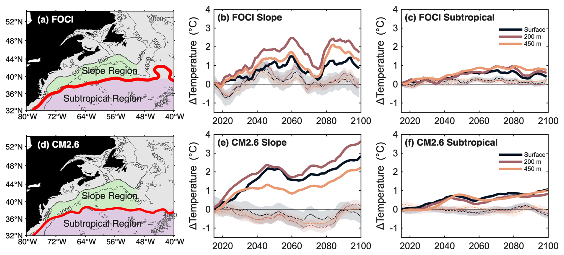 Figure 6Changes in seawater temperature in the slope and subtropical regions of the northwest North Atlantic from the FOCI and CM2.6 models. The left panels (a, d) show the defined regions: the slope region (green) and the subtropical region (purple) with the red contour marking the mean Gulf Stream path from the control simulation. The middle (b, e) and right (c, f) panels depict the temperature change (ΔTemperature) relative to the 2015 annual mean. Solid lines correspond to the warming runs, and dotted lines to the control runs, with shaded areas showing one standard deviation around the annual mean (natural variability). The top row (a–c) shows results from FOCI, and the bottom row (d–f) shows results from CM2.6. Trend statistics are provided in Table S2.