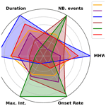 Figure 3The radar chart is a comparison of all product metrics. The average of MHW metrics are computed for all events detected in the tropical Pacific over 1993–2021 for each product, and normalized by the product that reaches the maximum metric so that all values of the radar chart vary between 0 and 1 (plotted along the radial axes).