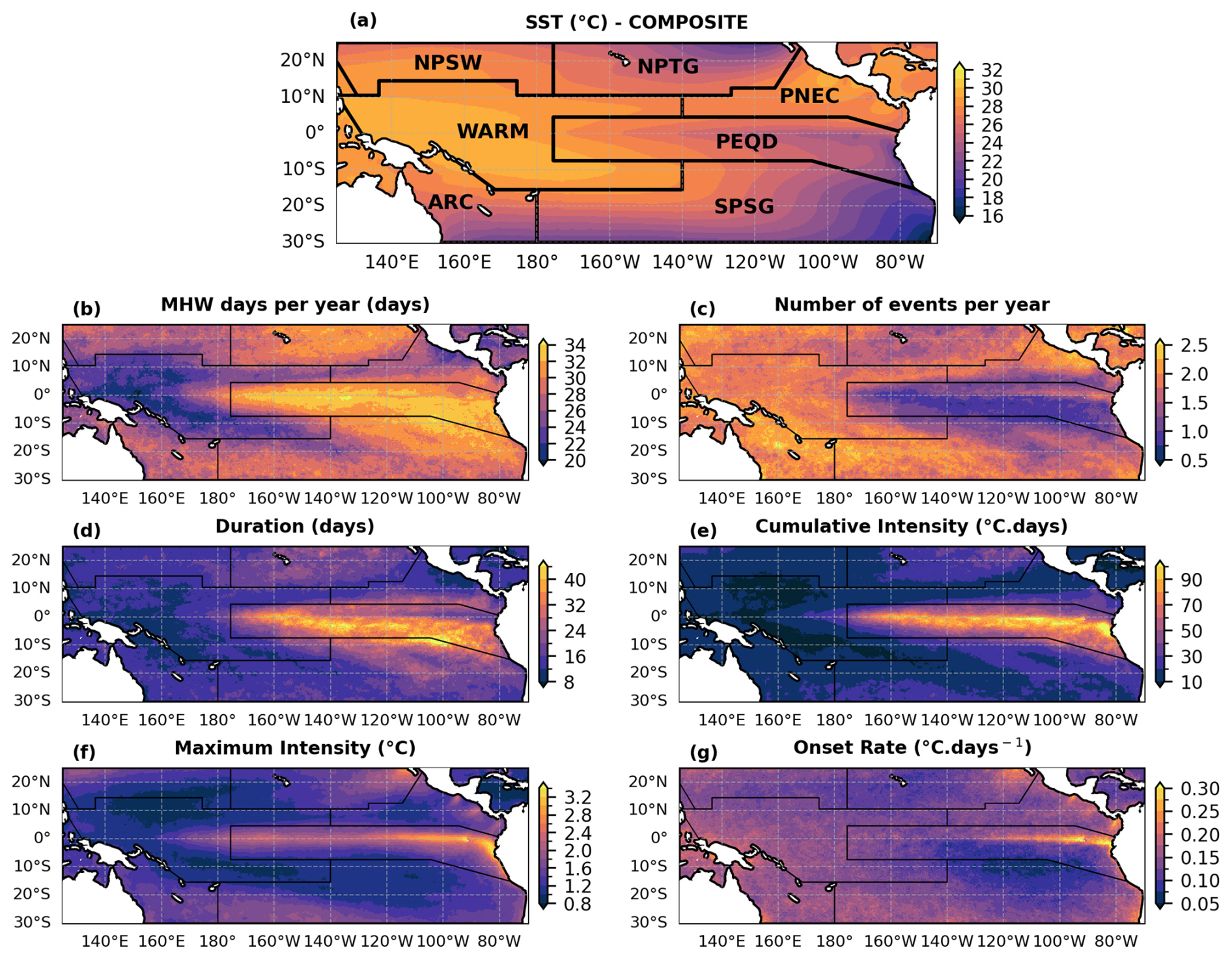 Pagli, B., Izumo, T., Barboni, A., Chevillard, C., Dutheil, C., Legrand, R., Menkes, C., Rocuet, C., and Cravatte, S.: Marine Heatwaves across the central South Pacific: characteristics, mechanisms, and modulation by the El Niño Southern Oscillation, EGUsphere [preprint], https://doi.org/10.5194/egusphere-2025-4166, 2025.