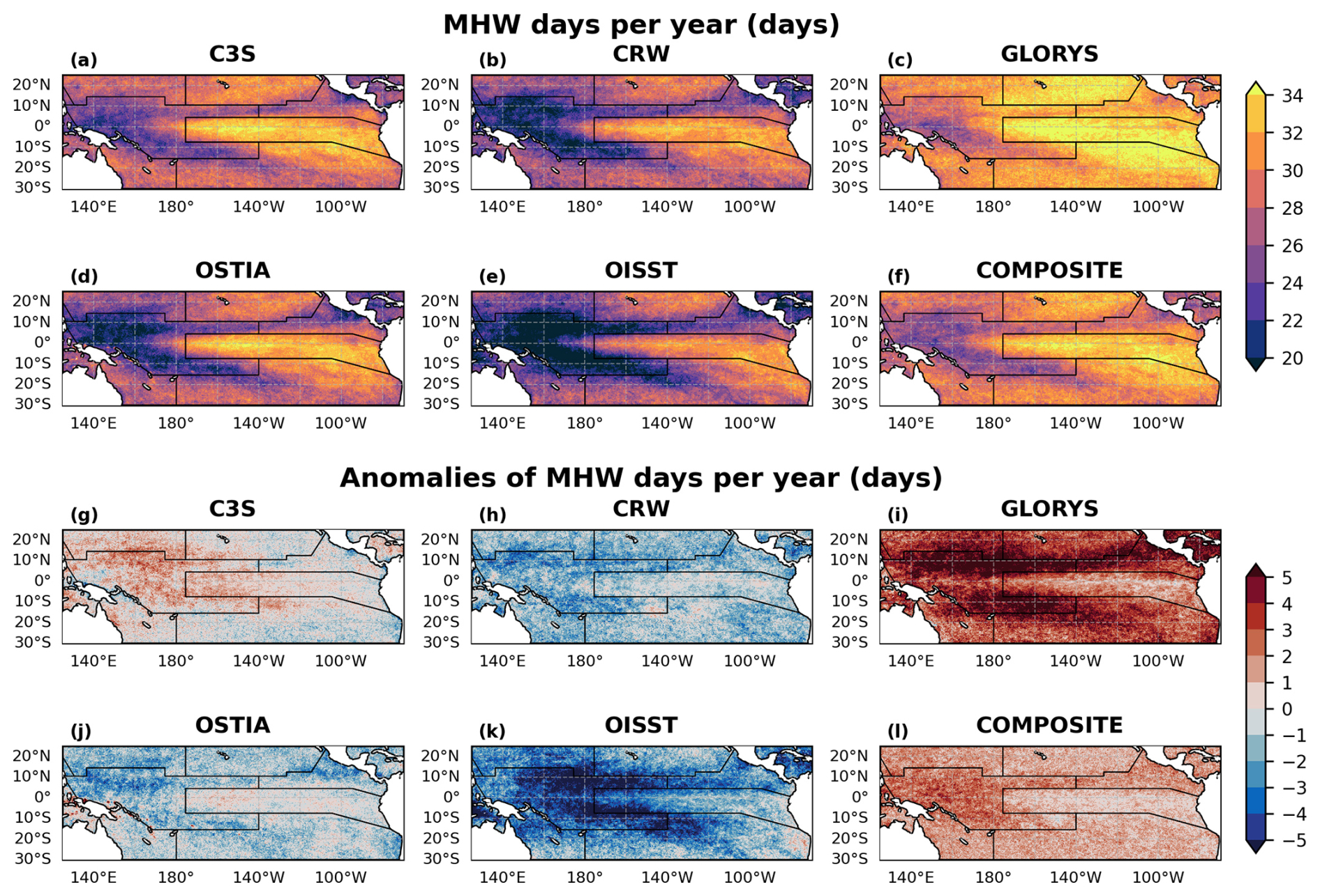Inter-product differences in MHW detection were illustrated by maps of mean MHW metrics for each SST product over the tropical Pacific and the time period (1993–2021). For duration, maximum intensity, cumulative intensity and onset rate, each pixel of these maps was defined as the mean value across all MHWs detected between 1993 and 2021 in this pixel. For the number of MHW days per year and the number of events per year, the maps were defined at each pixel as in Sect. 2.2.2.