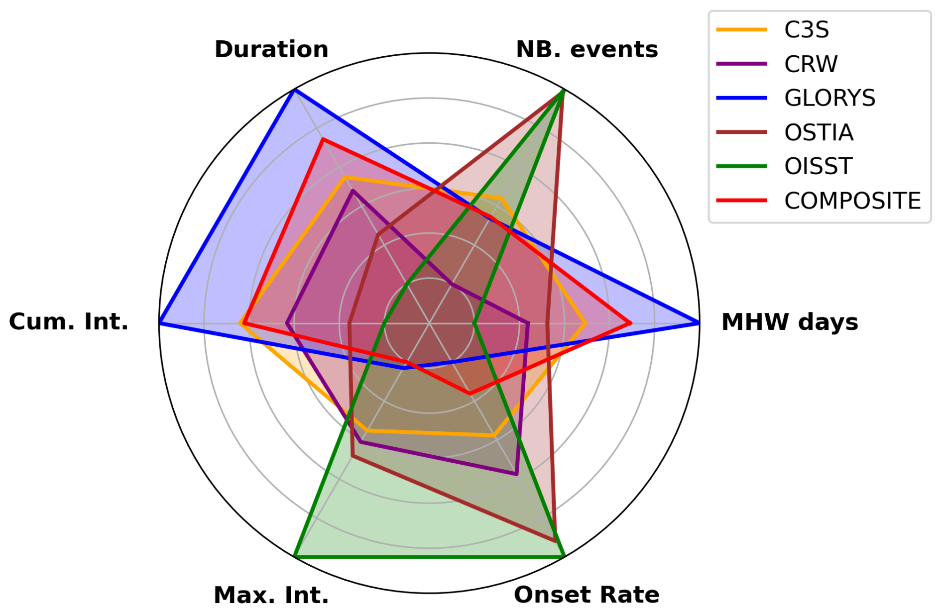 To summarize inter-product differences, the average of MHW metrics for all events detected in the whole domain over 1993–2021 were computed for each product. For a given metric, the minima and maxima across products of these average values were defined so that values on Fig. 3 represent the average value of the given product minus the minimum across products, divided by the difference between maximum and minimum. This normalization standardizes the results between 0 (product ranking last) and 1 (product ranking first) allowing an easier comparison between products. The distance to the center also gives the information on whether the averaged values of some products are closer to others and if some products behave differently. In the study area, OISST ranks first for maximum intensity, onset rate, and the number of events detected (Fig. 3). By “ranking”, we only mean to compare products but not to determine if one performs better than another. Conversely, OISST shows the lowest ranking for the number of MHW days, duration and cumulative intensity (Fig. 3). The opposite pattern is observed for GLORYS12v1 reanalysis which shows the highest ranking for duration, cumulative intensity and the number of MHW days detected, while it ranks last for MHW maximum intensity and onset rate. The COMPOSITE product tends to show a similar radar shape as of GLORYS12v1 (Fig. 3). OISST and GLORYS12v1 also stand out in this study, consistently occupying either the lowest or highest ranks across MHW metric estimates even if their variable ranking differs in a complementary manner. By contrast, C3S shows a more “balanced” radar chart, with no clear overestimation or underestimation compared to other products. These findings are consistent with the anomaly analysis presented in Figs. 2 and S1–S5.