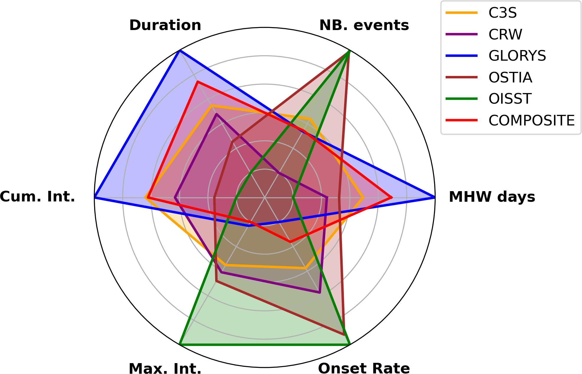 Our results suggest that MHW detection is particularly sensitive to the high frequency variability of the SST signal. The combined analysis of the standard deviation of the high frequency SST signal (filtered at 15 d) in Appendix A (Fig. A1) and the radar chart of Fig. 3 suggest that spiky signals with stronger high frequency variability like OISST and OSTIA detect higher maximum intensity, onset rate and number of events, but lower duration, cumulative intensity and number of MHW days per year. On the opposite, smoother products like GLORYS12v1 or the COMPOSITE with lower high frequency variability (Fig. A1) detect lower maximum intensity, onset rate and number of events, but higher duration, cumulative intensity and number of MHW days per year (Fig. 3). Thus, the similarity of behaviours between GLORYS12v1 and the COMPOSITE (Fig. 3) might reflect the smoothing effect induced by the multi-product mean SST. These effects of high frequency variabilities were also seen in the SST time series of Fig. 12: climatological levels were similar between products, but OISST and OSTIA signals showed larger high frequency variability (confirmed by Fig. A1), which resulted in the detection of more MHWs of shorter durations (that duration reached 73 and 74 d maximum, respectively, Fig. 12), while GLORYS12v1 or the COMPOSITE showed smoother signals and detected fewer MHWs but of longer durations (duration of maximum 162 d for GLORYS12v1, Fig. 12).