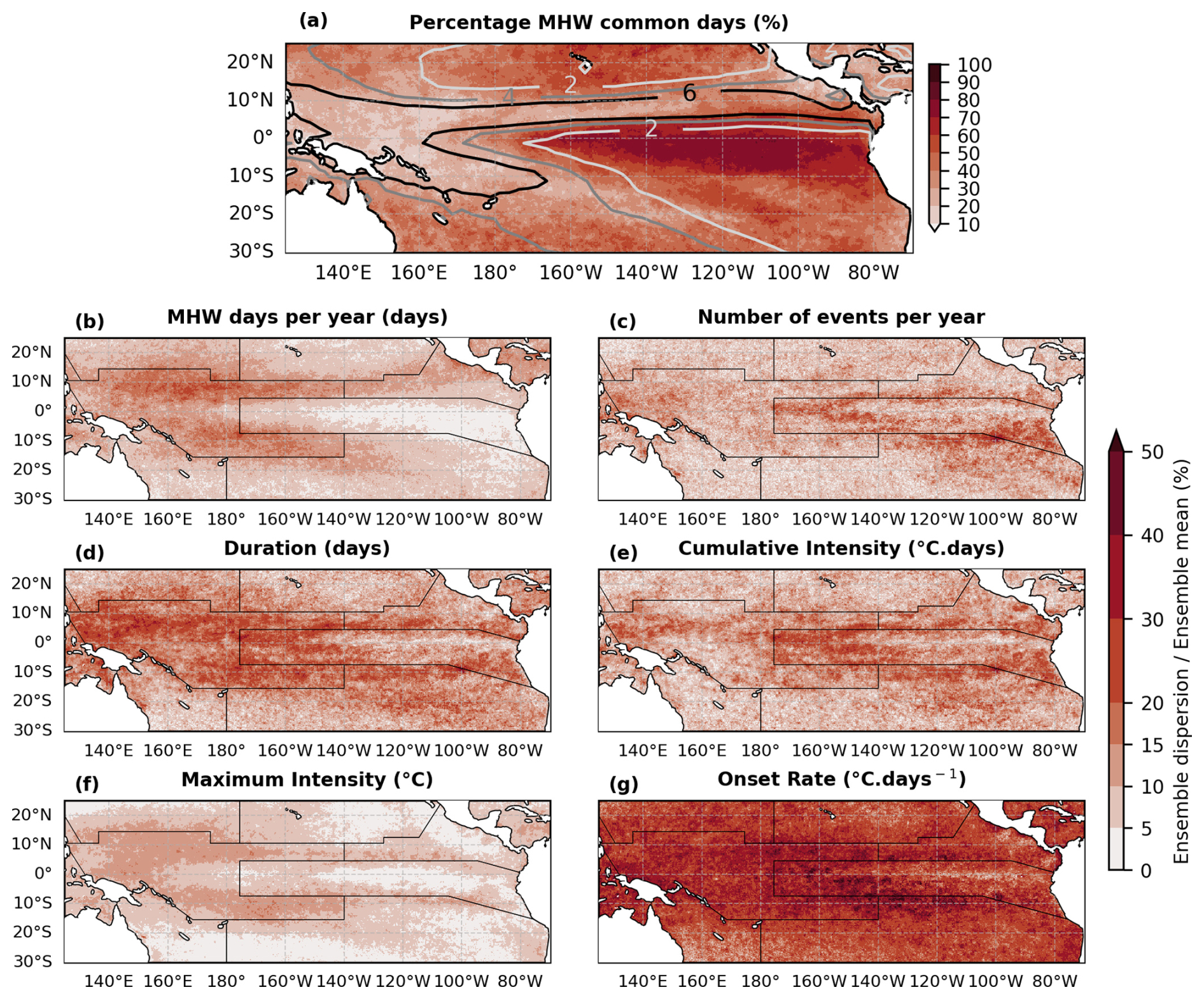 Figure 4(a) Percentage of MHW days detected simultaneously by C3S, CRW, OSTIA, OISST and GLORYS12v1 (Sect. 2.3.1), with mean 1993–2021 ERA5 precipitation contours overlaid (in mm d−1). (b–g) Normalized ensemble dispersion for each MHW metric (value in %, Sect. 2.3.1). Black lines indicate regions' limits.