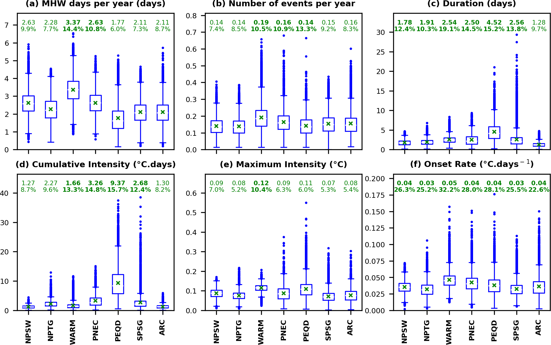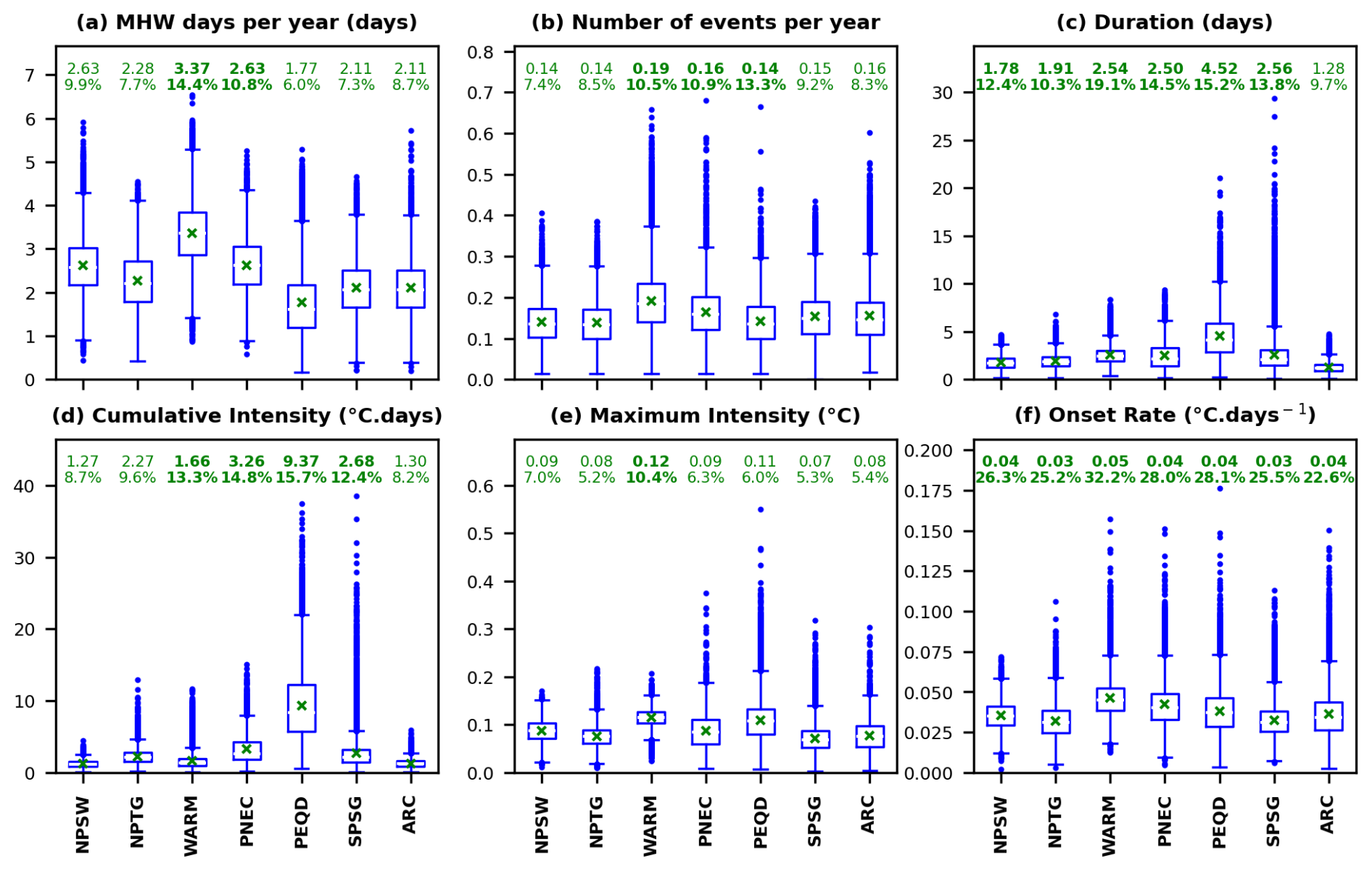 In the southwest tropical Pacific, MHW occurrence is modulated by La Niña conditions (Sen Gupta et al., 2020; Lal et al., 2025). In the ARC, mesoscale eddies close to the eastern Australian coast (Bian et al., 2023; Chapman et al., 2025) along with downwelling Rossby waves and downwelling-favourable winds also favor MHW development (Misra et al., 2021; Li et al., 2023; Lal et al., 2025). In this region, MHWs are relatively frequent (more than 2 events per year, Fig. 1c) but short (less than 15 d, Fig. 1d, Holbrook et al., 2019). Both the number of MHW days and the maximum intensities are close to the tropical Pacific average (around 25 d and 1.5 °C, respectively, Fig. 1b and f). Similar MHW characteristics are observed in the western SPSG and in NPSW. The Northeastern part of the SPSG close to the PEQD is rather influenced by ENSO, with fewer MHWs of longer duration and lower onset rate. The shortest MHWs (less than 10 d, Fig. 1d) are observed in the WARM region. Here, the number of MHW days per year, as well as the cumulative and maximum intensities reach their lowest levels in the tropical Pacific (∼15 d yr−1, <10 °C d and 1 °C, respectively). Nevertheless, this region records a high number of events with more than 2.5 events per year close to the Papua New Guinea and eastern Indonesian coasts (Fig. 1c, also observed in Holbrook et al., 2019; Oliver et al., 2021).