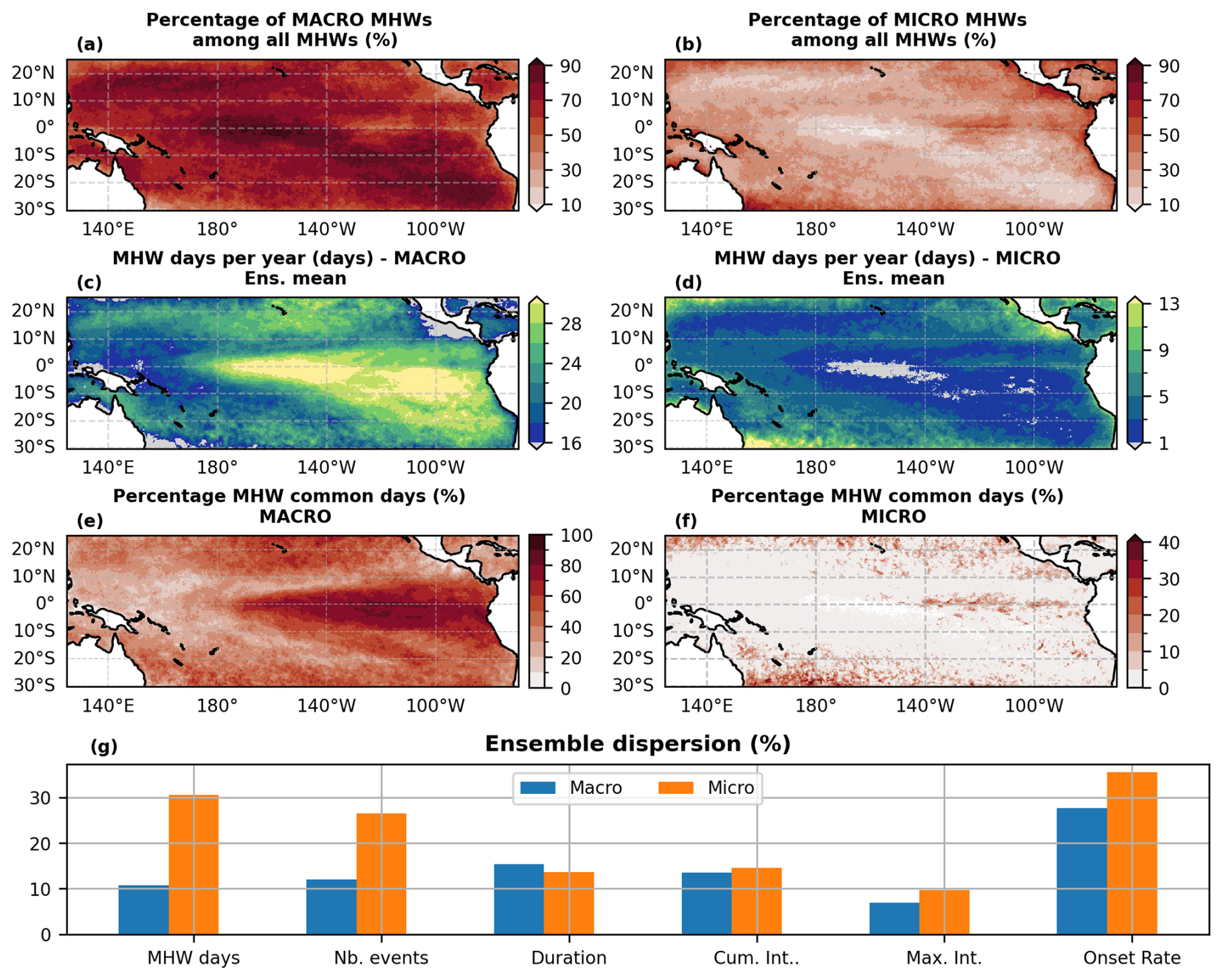 Figure 6(a) Percentage of macro-scale MHWs among all events detected over 1993–2021 (i.e. ensemble mean of the total number of macro events divided by the ensemble mean of the total number of MHWs of all types, multiplied by 100). (b) Same as (a) for micro-scale MHWs. (c) Ensemble mean of total MHW days per year for macro scale events. (d) Same as (c) for micro-scale MHWs. (e) Percentage of MHW days detected simultaneaously by C3S, CRW, OSTIA, OISST and GLORYS12v1 (Sect. 2.3.1) over 1993–2021 for macro scale events. (f) Same as (e) for micro-scale MHWs. (g) Spatial average over the tropical Pacific of dispersion values for each metric for macro-scale MHWs (blue bars) and micro-scale MHWs (orange bars).