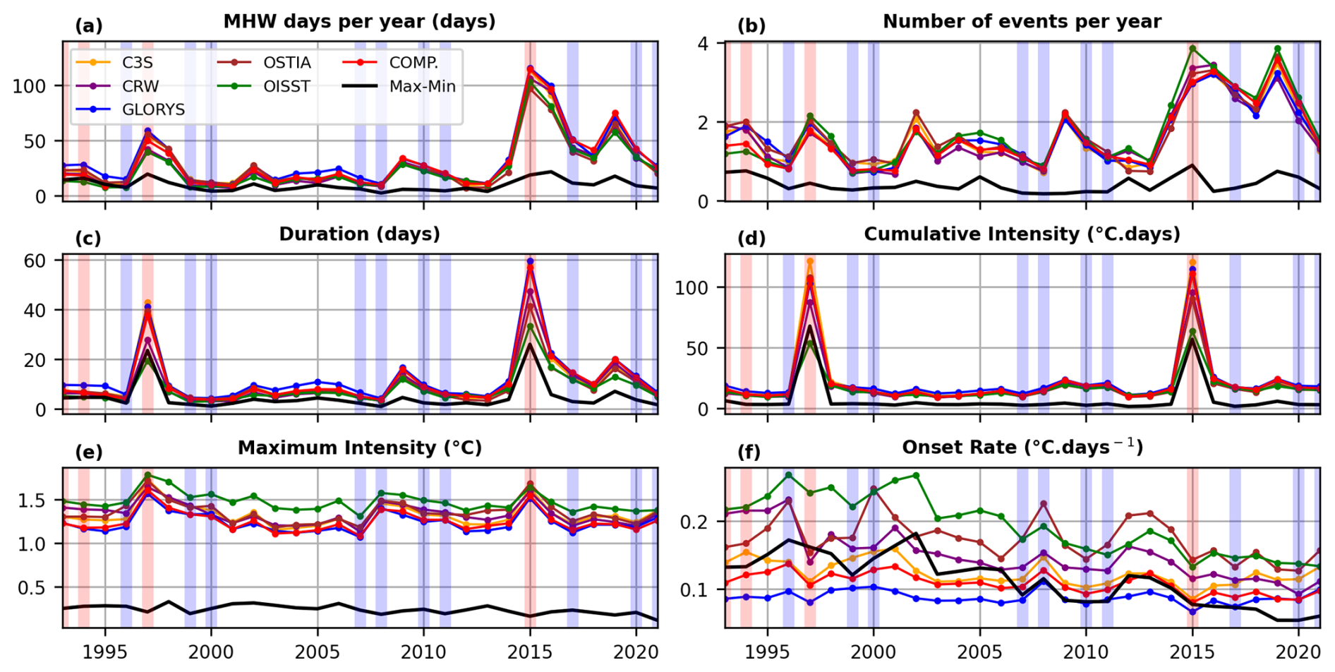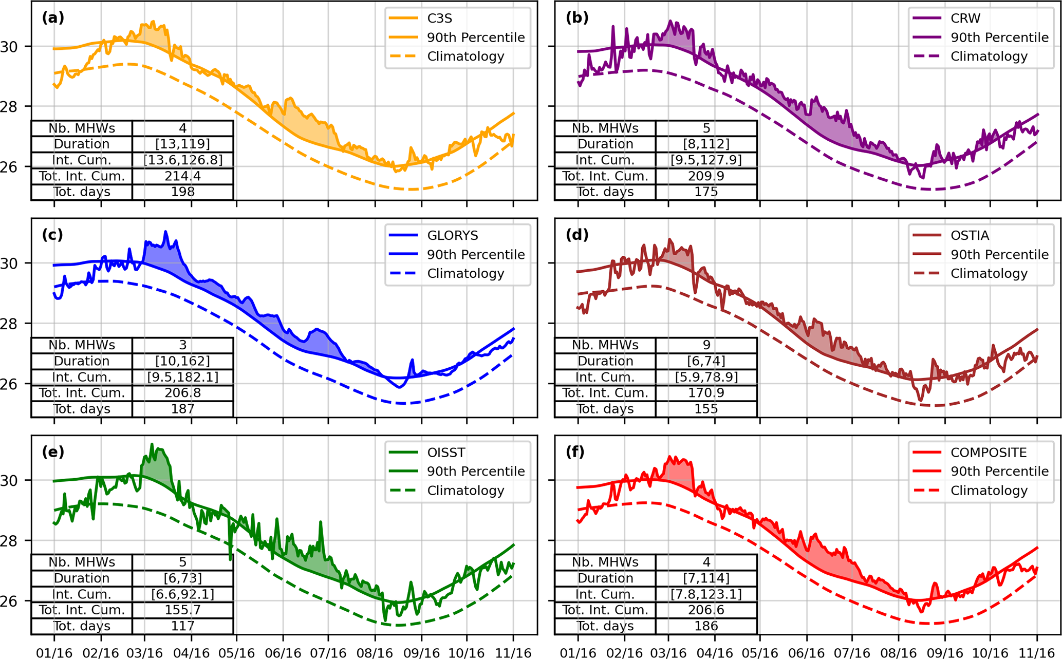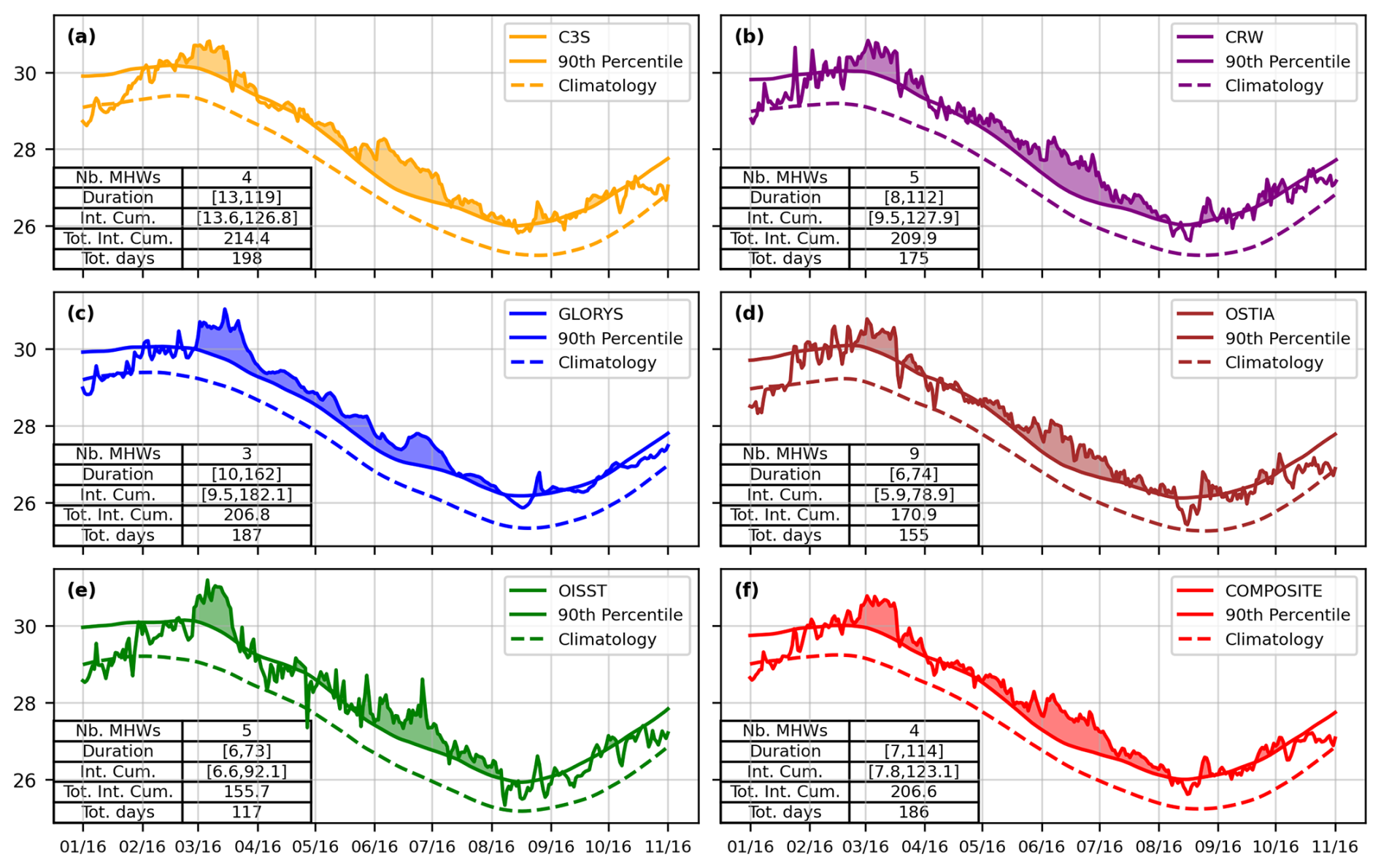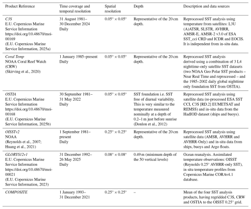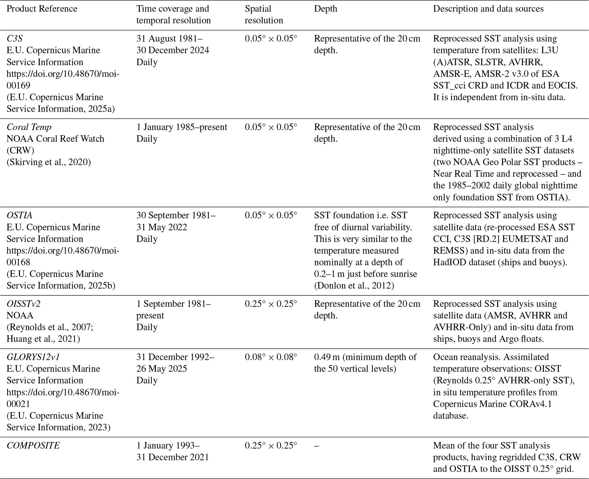 All datasets used in this study are open source and available online. Temperature data from C3S, OSTIA and GLORYS12v1 are available on Copernicus: https://doi.org/10.48670/moi-00169 (E.U. Copernicus Marine Service Information, 2025a), https://doi.org/10.48670/moi-00168 (E.U. Copernicus Marine Service Information, 2025b), https://doi.org/10.48670/moi-00021 (E.U. Copernicus Marine Service Information, 2023), respectively. The CRW data were downloaded from https://coralreefwatch.noaa.gov/product/5km/index.php (last access: 25 September 2019 for years 1993 to 2019, and daily update after this date until 2021) (via ftp). The OISSTv2 data were downloaded from https://psl.noaa.gov/data/gridded/data.noaa.oisst.v2.highres.html (last access: 15 March 2023). All scripts used to obtain the results presented in this study were written in Python and can be shared upon request.