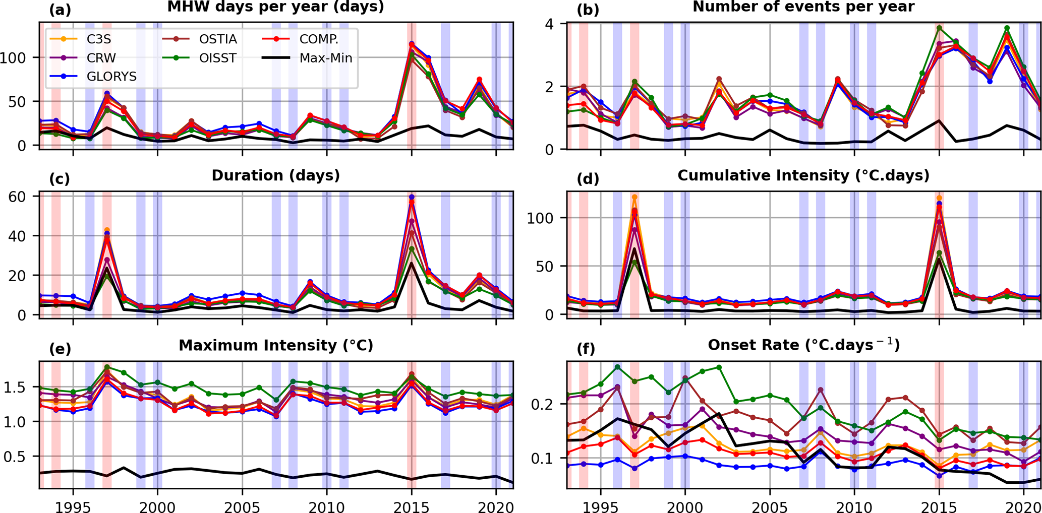 Figure 7(a–f) Yearly time series of MHW metrics averaged over the tropical Pacific for each product. Inside each panel, the black line represents the largest inter-product difference value for each year (maximum−minimum). The red and blue backgrounds indicate years of strong El Niño and La Niña, respectively, according to the ONI index.