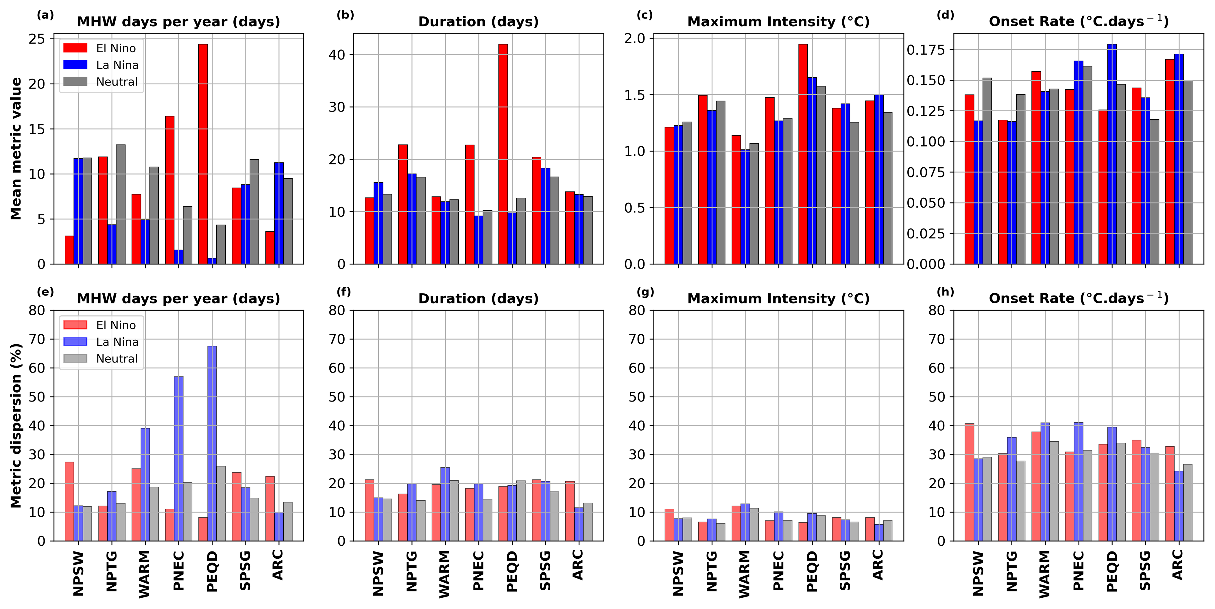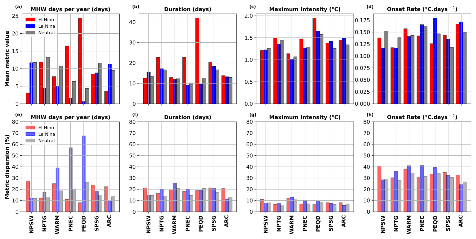 Figure 8(a–d) Histograms of the spatial means of MHW metrics (ensemble mean) inside the seven regions of study for the MHW days per year (a), duration (b), maximum intensity (c) and onset rate (d) for El Niño MHWs (red), La Niña MHWs (blue) and neutral (gray). (e–h) Histograms of the spatial mean of ensemble dispersion inside the seven regions of study for the MHW days per year (e), duration (f), maximum intensity (g) and onset rate (h) for El Niño MHWs (red), La Niña MHWs (blue) and neutral (gray).