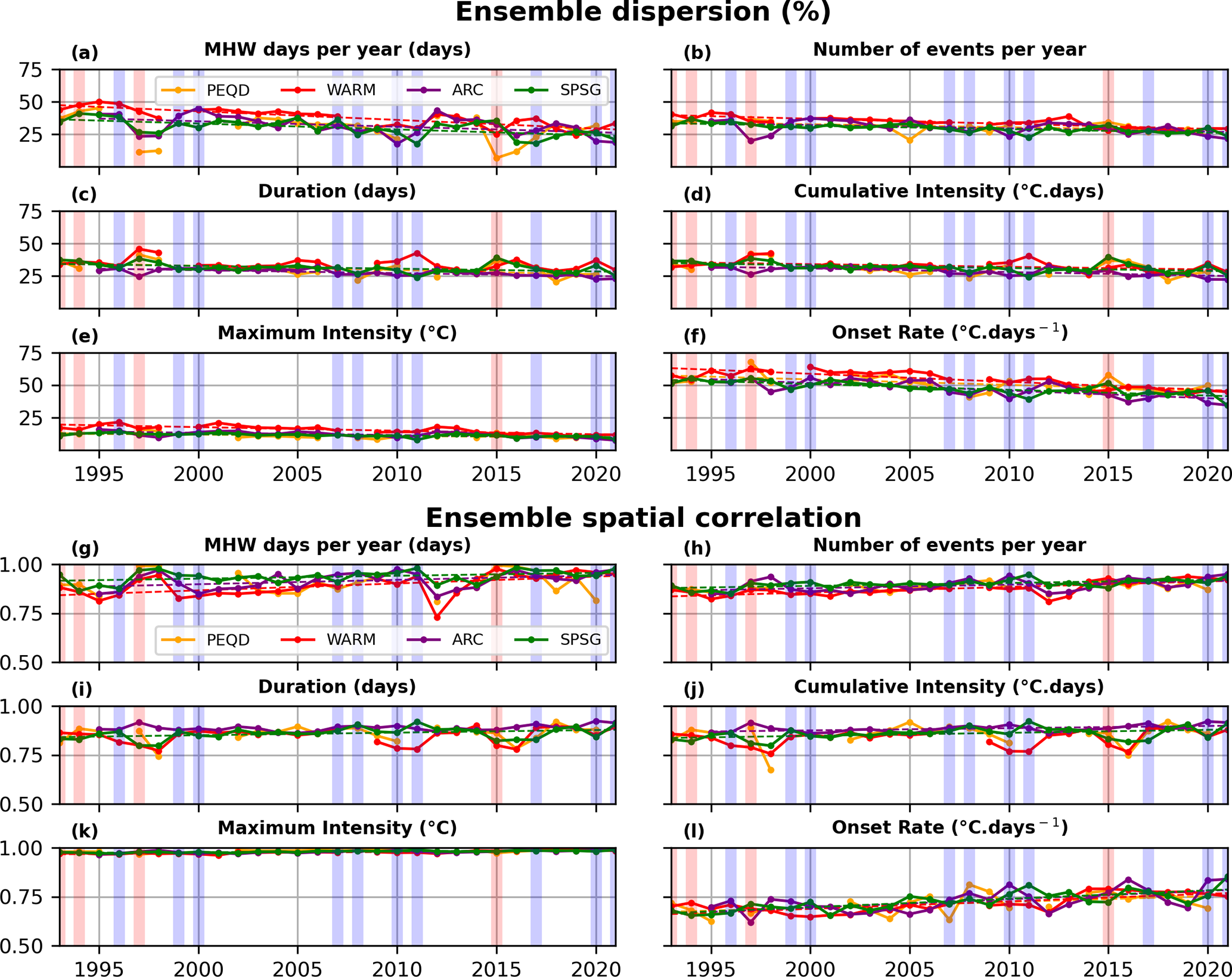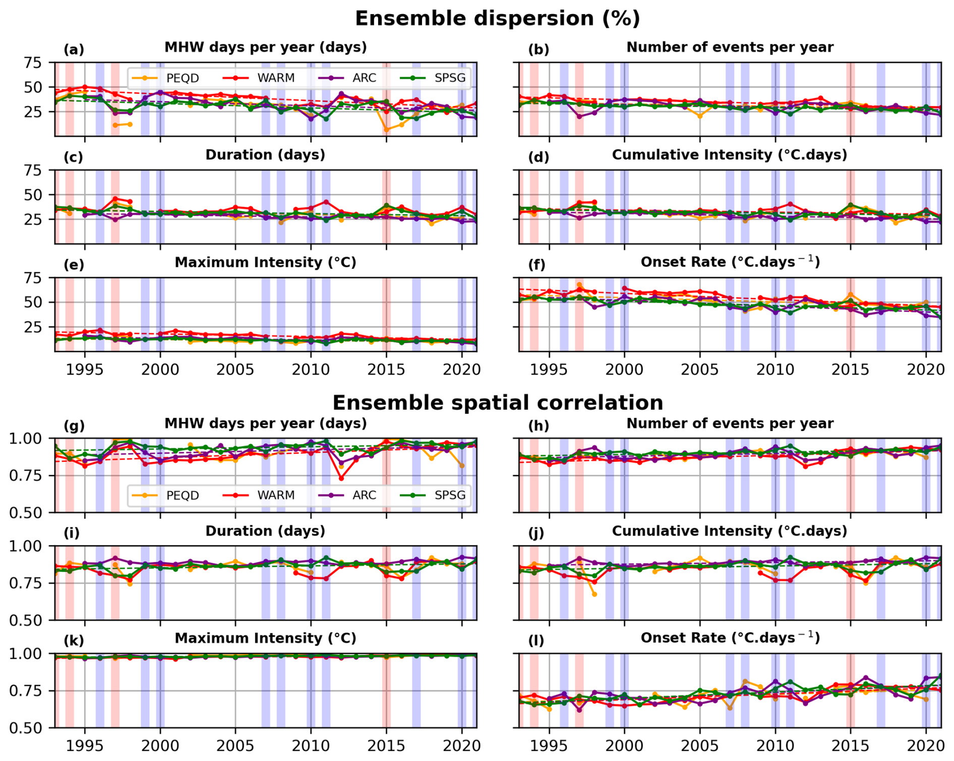 Fourth, ensemble dispersion and spatial correlation show an interannual variability partly linked to ENSO variability. For both statistics, MHW days per year shows the highest interannual variability which is marked by the strong El Niño years of 1997–1998 and 2015–2016 (minima of dispersion and maxima of spatial correlation). On the contrary, the maximum intensity shows the lowest interannual variability among metrics (Figs. 9 and S7). Yet, the effects of ENSO variability on ensemble dispersion and spatial correlation depend on various factors. They can vary between metrics inside a same region: in the PEQD (where the effects of El Niño are strong, as shown above), dispersion is clearly lower for strong El Niño years (1997–1998, 2015–2016) for the total MHW days per year while it is not the case for the duration, number of events per year, cumulative intensity and onset rate (dispersion similar or even higher than other years, Fig. 9a–f and also seen in Fig. 8). The effects of ENSO variability can also vary between regions for a same metric: duration shows higher spatial correlations for strong El Niño years in most regions but not in WARM and SPSG where spatial correlation is lower these years and maxima is reached in 2011 (La Niña) in SPSG (Fig. 9i).