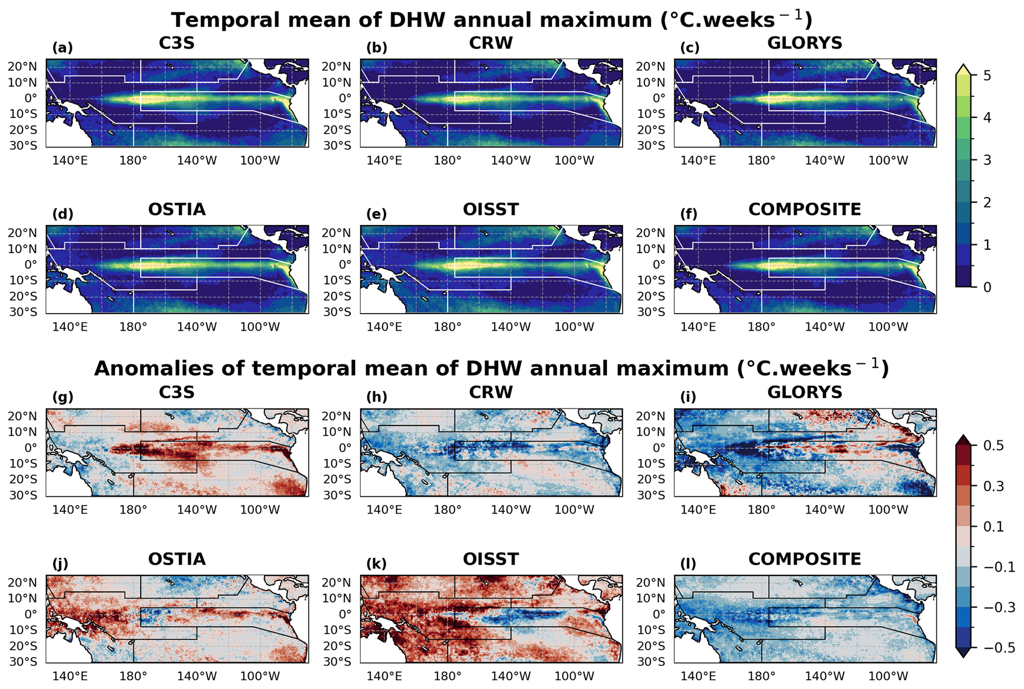 The temporal mean of DHW annual maxima over 1993–2021 in the tropical Pacific (Fig. 10a–f) highlights the influence of ENSO on the DHW, with highest values being observed in the central and eastern Equatorial Pacific (more than 5 °C weeks) for all products. Such influence is also seen on the yearly time series of DHW annual maximum for each product (Fig. 11a, spatial average over the tropical Pacific), with maxima observed in strong El Niño years of 1997–1998 and 2015–2016. Figure 10 highlights significant inter-product differences for DHW annual maximum, with anomalies ranging between ±0.5 °C weeks (Fig. 10g–l), and even higher in the western and central eastern equatorial part of the basin. Over the tropical Pacific, the highest positive anomalies are observed for OISST and C3S while the highest negative anomalies are observed for GLORYS12v1. Inter-product differences of more than 1 °C weeks are observed between C3S and GLORYS12v1 in the PEQD close to the south American coast (80° W, 0°) and between OISST and GLORYS12v1 in a large area around (140° E, 10° S), between northern Australia and Indonesia.