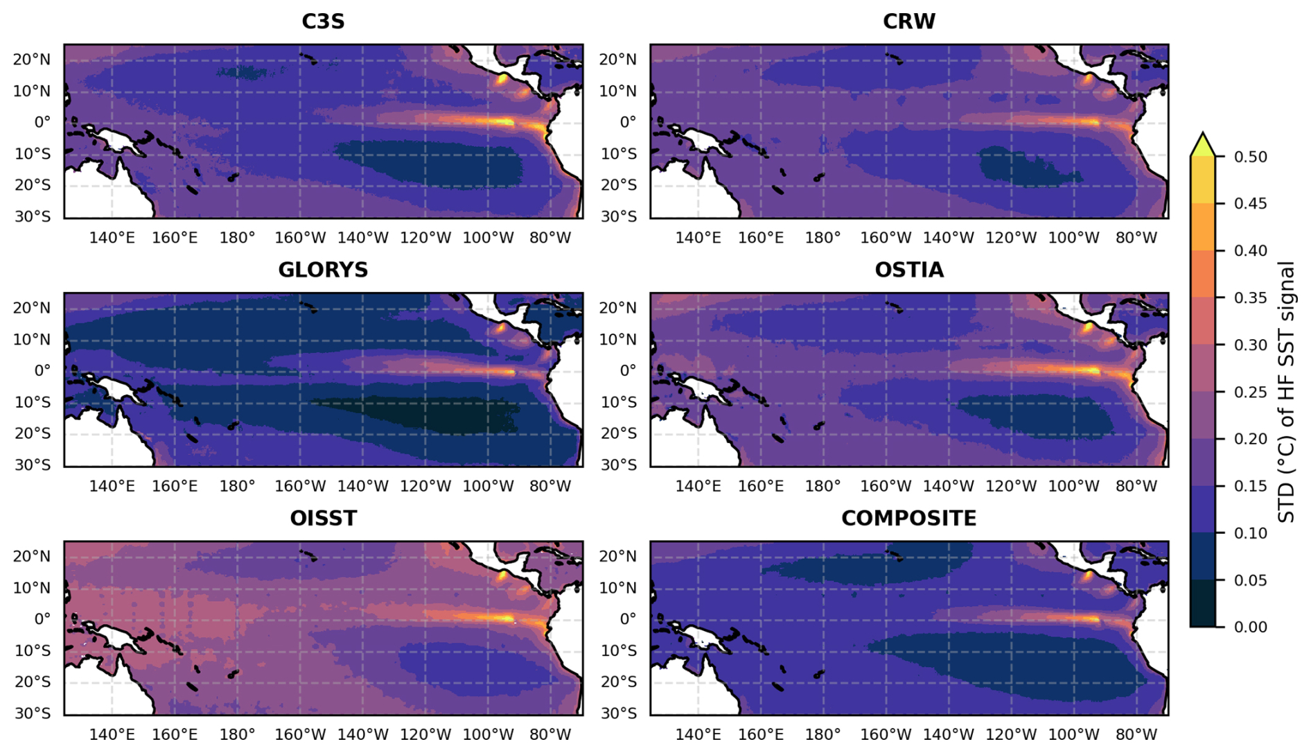 Firstly, our results highlight the importance for MHW scientists to understand the behaviour of the SST product selected in their study, particularly its relative “ranking” compared to other products, which varies according to both the metric and the region considered (Sect. 3.2) but also according to the time period of interest (as magnitude of inter-product differences varies between years, Sect. 3.3.3). The evaluation of the high frequency variability of the SST signal can also give valuable information on the product chosen since it influences MHW detection, as explained in Sect. 4.2. Using several products for robustness is thus essential: because all SST products differ in their construction, we cannot a priori argue for a “best” dataset to be used for MHW detection without thorough evaluation against in situ and independent SST dataset. Yet, Fiedler et al. (2019) performed a comparison of SST datasets to in situ data and summed up the key strengths and weaknesses of various analyses compared to the others. Beyond characterizing product behaviour, MHW studies should also account for the uncertainty associated with SST product choice when reporting MHW metric estimates. When feasible, the use of several SST datasets can substantially increase the robustness of the results, by defining upper and lower bounds of metric estimates. The same recommendations apply for DHW studies, with other studies underlining the need to compare indicators of thermal stress from different data sets (Neo et al., 2023; Margaritis et al., 2025).