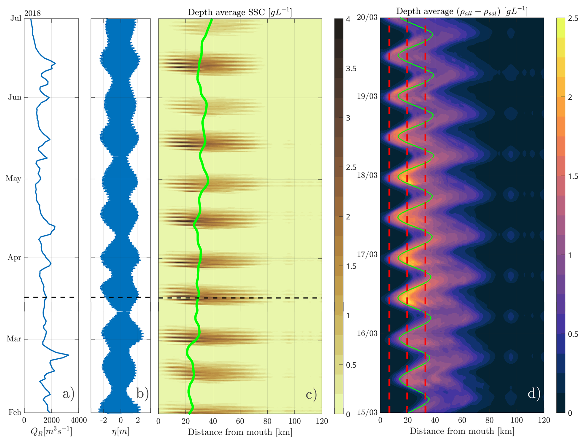 To study the importance of the SSC over density calculations, the following sections are focused on the wet-season period (February–June). During this period, the ETM is located in the downstream region of the estuary and it was well reproduced by the model (Fig. 2c). It spans ∼ 70 km with maximum depth-averaged concentrations close to 3 g L−1. Particularly, enhanced SSC exceeding depth averages of 4 g L−1 occurred after events of increased river discharge (exceeding 1500 m3 s−1) in February, April, or June but only during spring tides.