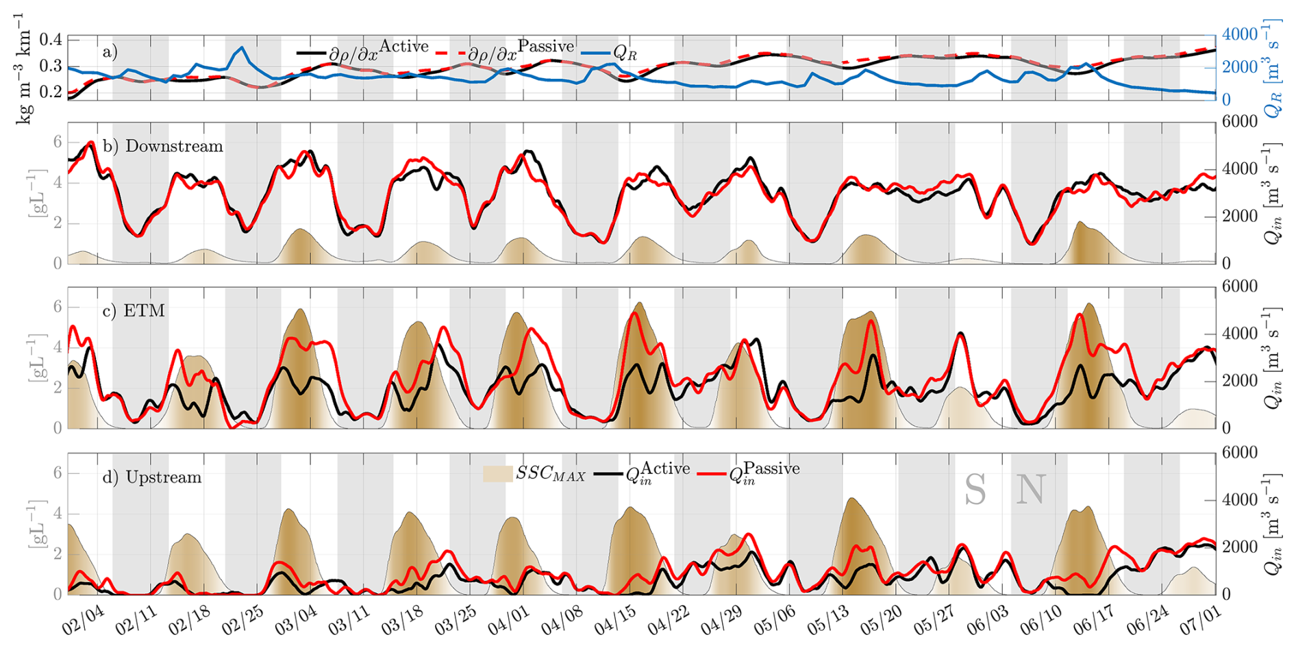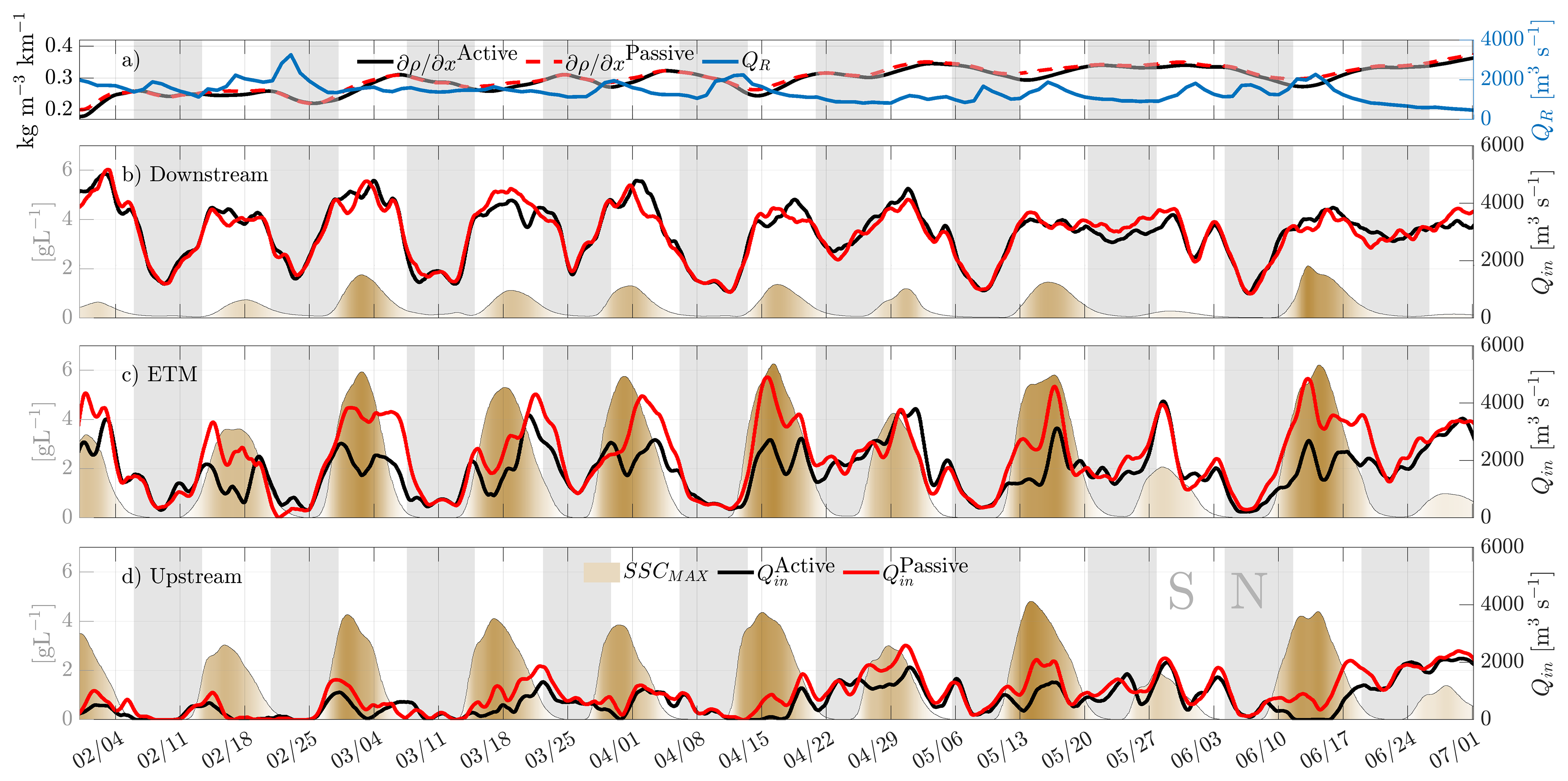 Figure 3The combined river discharge from both the Garonne and Dordogne (blue line) together with the longitudinal density gradient from the active (black line) and the passive (red-dashed line) model are shown in panel (a). Panel (b) shows the downstream, (c) ETM and (d) upstream section. The black and red lines in (b), (c) and (d) correspond to the TEF volume inflow from the active model and the TEF volume inflow from the passive model , respectively. Also shown is the sectional maximum SSC per semi-diurnal per tidal cycle (brown regions) and neap periods (light-gray regions).