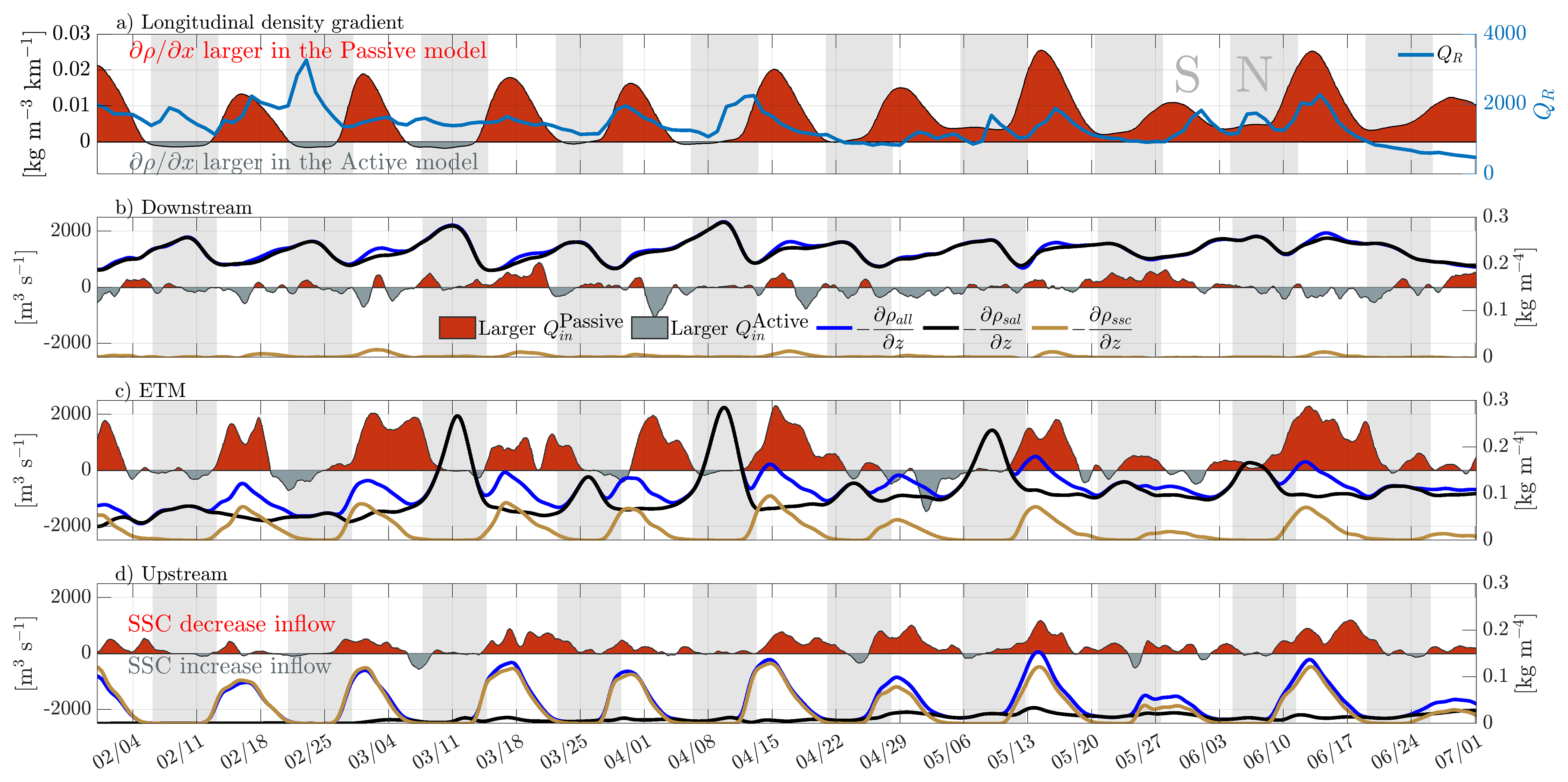 Figure 4Differences in the longitudinal density gradient between models and the combined river discharge are shown in (a). The red shaded region depicts when the longitudinal density gradient was larger in the passive model () and the gray shaded region indicates when the gradient was larger in the active model (). Also shown are the differences on TEF volume inflow between the models () at the downstream (b), the ETM (c) and upstream (d) sections. The red shaded regions depicts when the inflow from the passive model is larger (SSC decrease the inflow), and the gray shaded regions depicts when the active model is larger (SSC increase the inflow). The sectional-averaged vertical gradient of the density due to both SSC and salinity (, blue), the sectionally averaged vertical gradient of the density due to salinity (, black), and sectionally averaged vertical gradient of density due to sediments (, brown) are also shown. The light-gray regions depicts the neap tides periods.