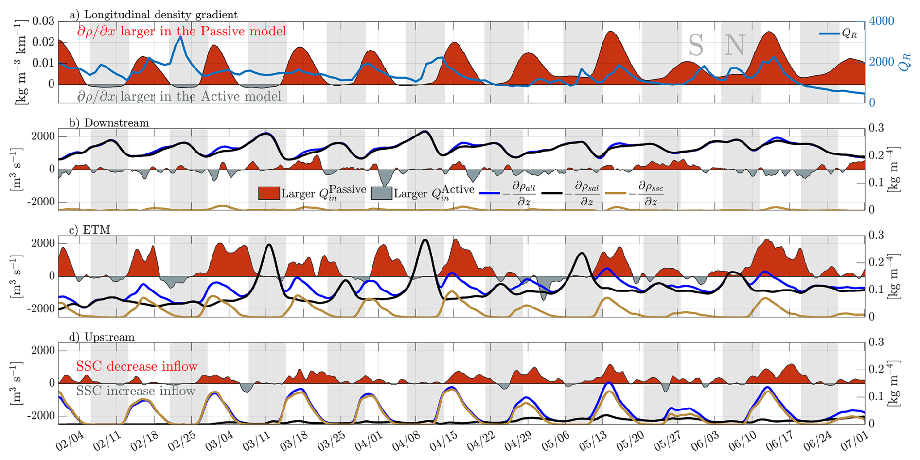 The longitudinal density gradient between the models showed large (> 0.01 ) differences only during spring tides. The consistent positive difference of indicates that the longitudinal density gradient decreases in the active model or when SSC are included in water density calculations. Downstream the vertical density gradient is dominated by salinity and only during spring tides SSCs increases amplifying (Fig. 4b). The situation is similar in the most upstream section, but the roles of salinity and SSCs are reversed due to the lack of salinity in the water column in this section. In fact, the vertical salinity gradient is less than 0.05 throughout the study period and the vertical density gradient is clearly dominated by (Fig. 4d).