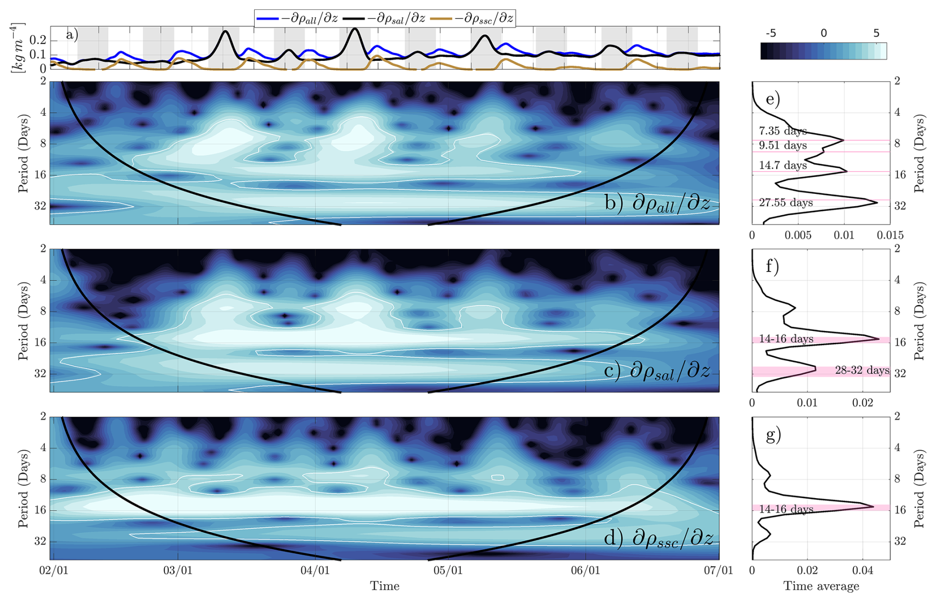 To determine the dominant periods of variability of the vertical density gradients presented above, and to establish links between stratification induced by salinity and SSC on the exchange flow, we applied a wavelet analysis to the time series of each density gradient component. This includes the total density gradient (), the salinity-induced density gradient (), and the sediment component () according to (6) (Torrence and Compo, 1998). Because the wavelet formulation developed by Torrence and Compo (1998) has a bias in the spectral estimate favoring large-scale features, we applied the wavelet rectification algorithm of Liu et al. (2007) allowing the comparison of the spectral peaks across scales.
