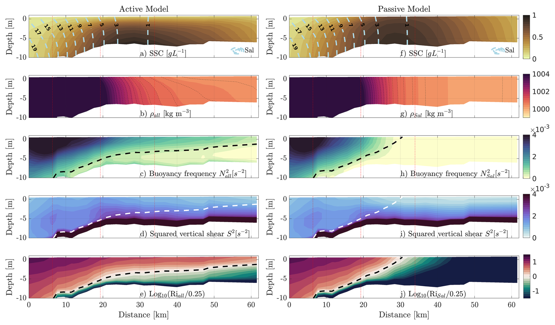 Figure 6Cross-sectional and time average of (a) SSC, (b) density ρ, (c) buoyancy frequency N2, (d) squared vertical shear S2 and (e) the normalized Richardson number for the active model. The plots (f–j) are the same as (a–e) but for the passive model. The averaged period corresponds to the time between the horizontal black lines in Fig. 2 (February–June). In the first row, also depicted are the average salinity contours (dashed-light-blue lines). In the second row, the contours of density from 1000 up to 1003 g L−1 on steps of 0.2 g L−1 are also highlighted (thin-dashed black lines). The downstream region has been saturated to highlight the changes in the upstream region. The Ri=0.25 line is highlighted in the third, fourth and fifth rows. Vertical red lines represent the location of the sections from Fig. 2.